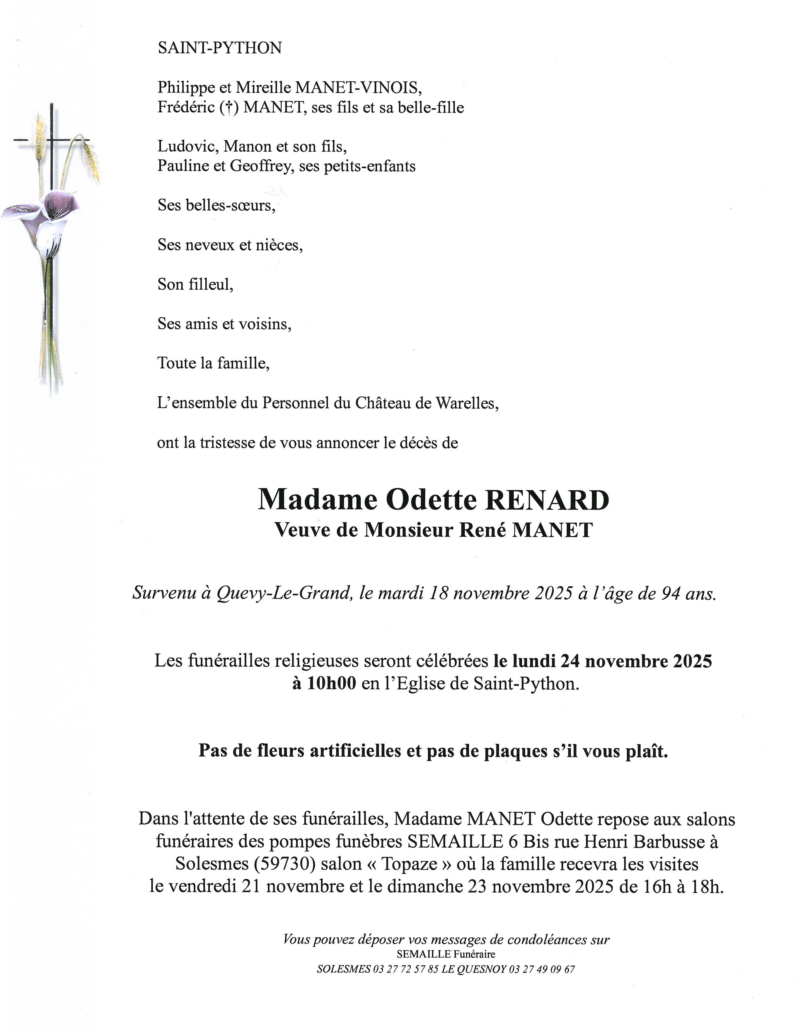 Cette page vous permet de présenter vos condoléances à la famille et de partager l'avis de décès de Odette.