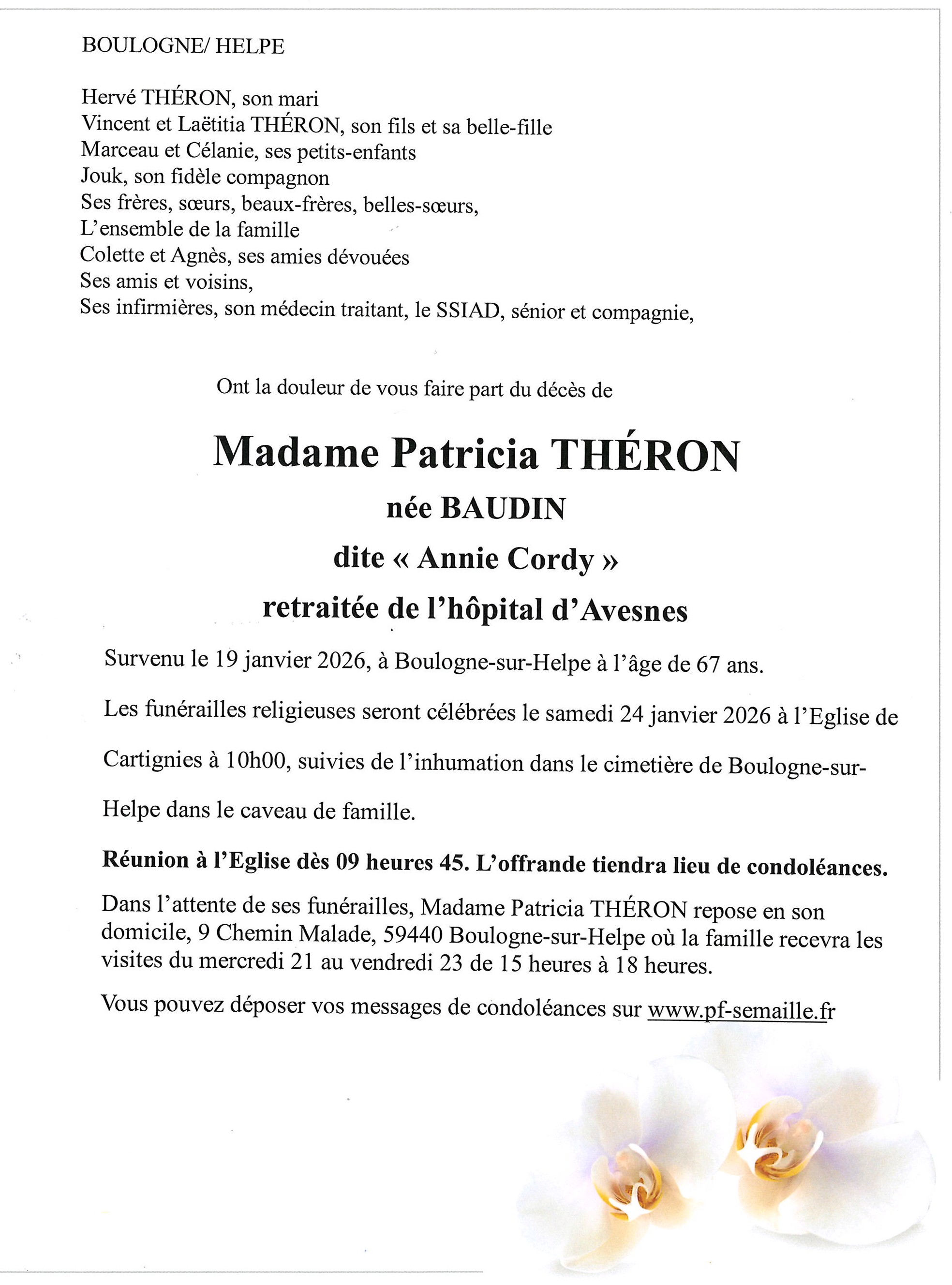 " Recevez nos sincères condoléances. Nous serons avec vous en pensées car la distance et la santé ne nous permet pas d être présent. Courage à tous et sachez que Patricia sera toujours présente avec nous.