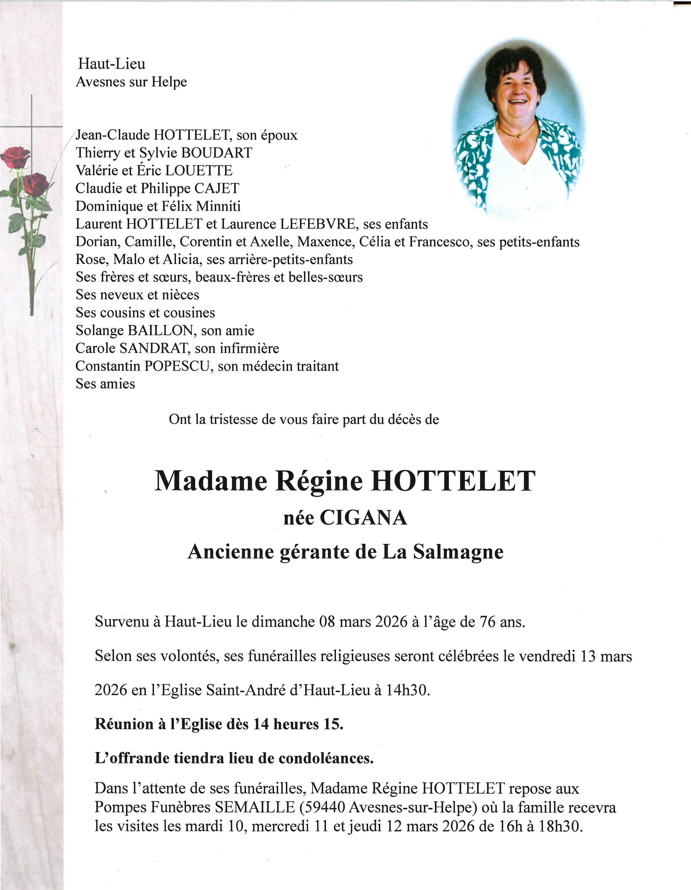 Avis de décès de Madame RÉGINE HOTTELET née CIGANA