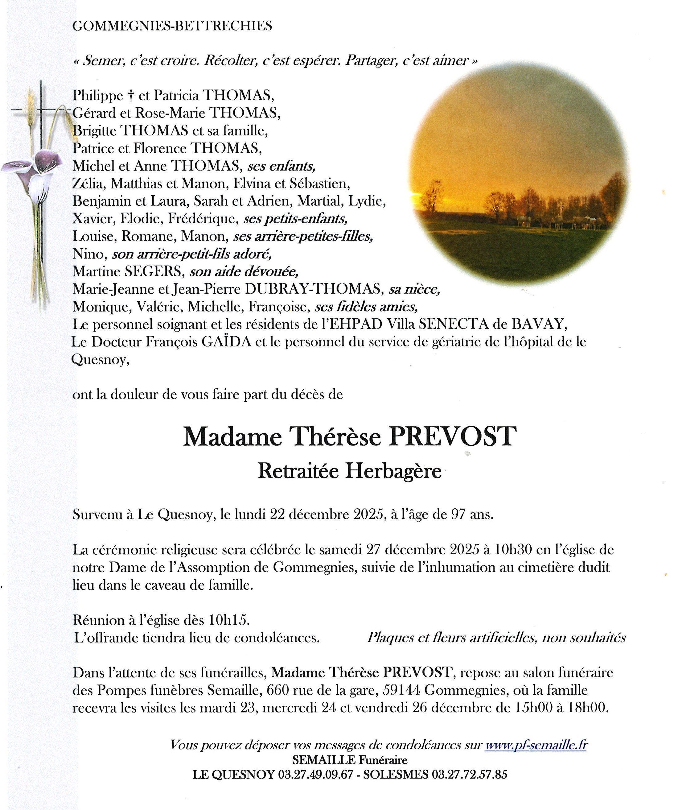 Déroulement des funérailles de Madame Thérese PREVOST