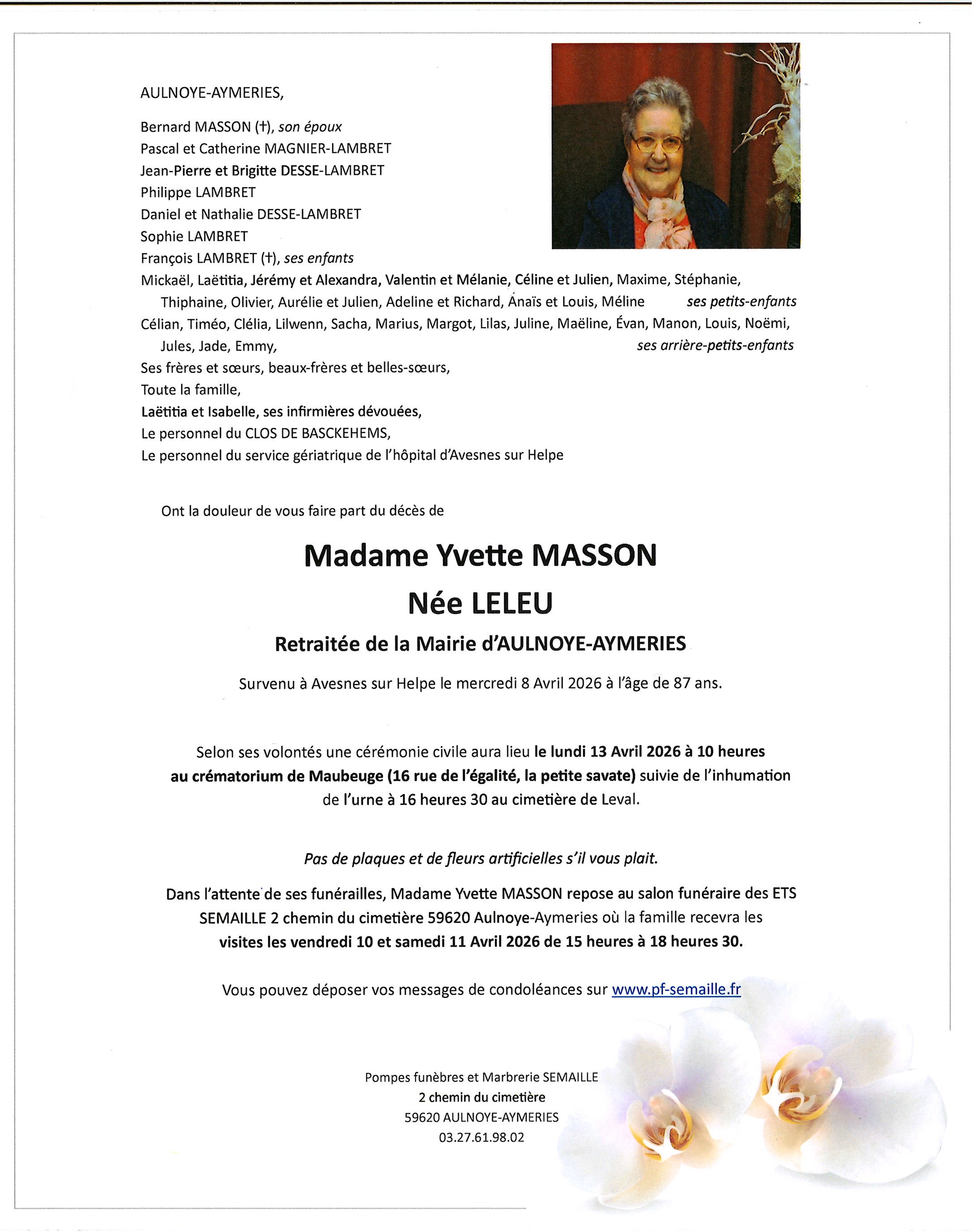 Avis de décès de Madame Yvette MASSON née LELEU