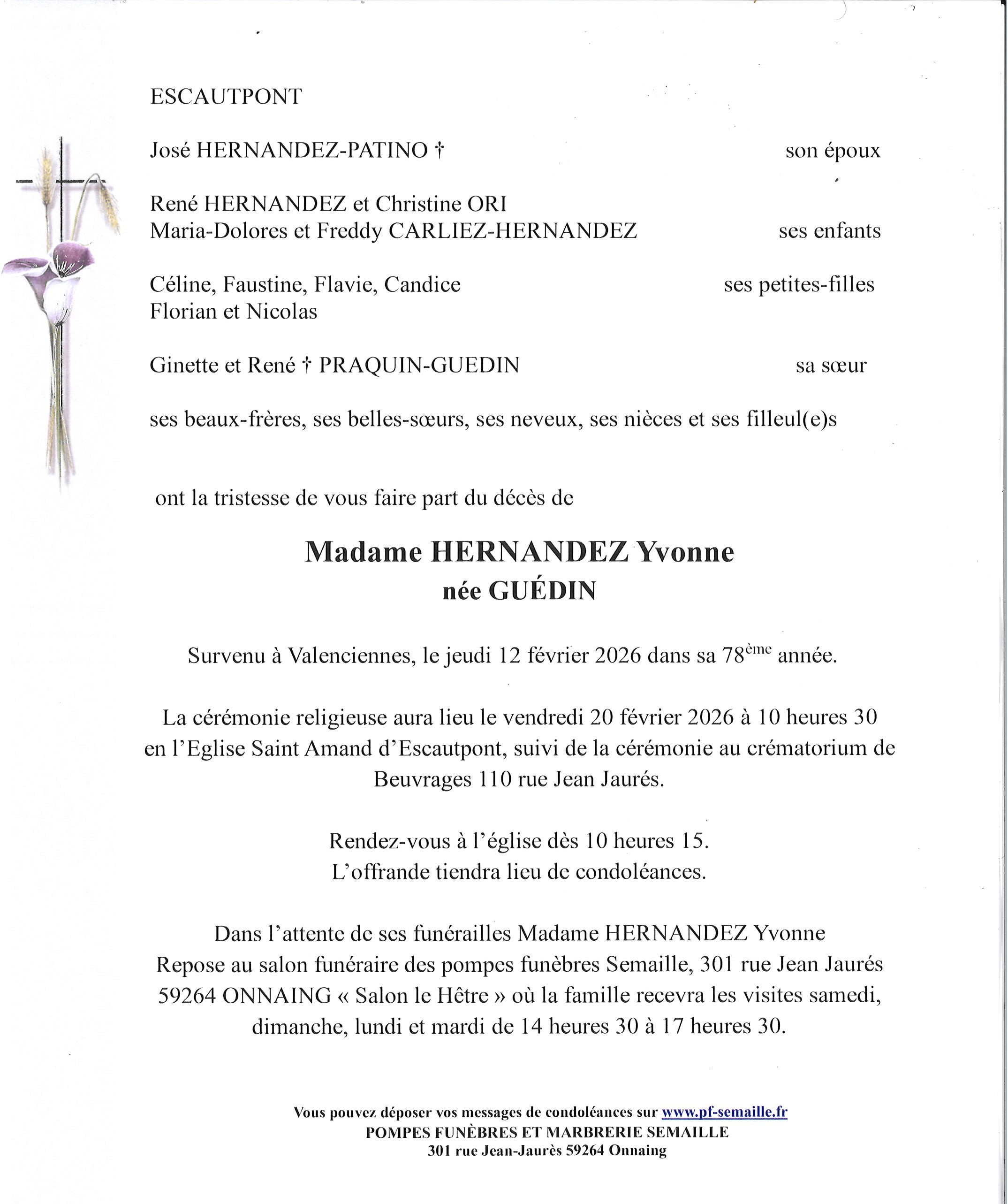 Avis de décès de Madame Yvonne HERNANDEZ