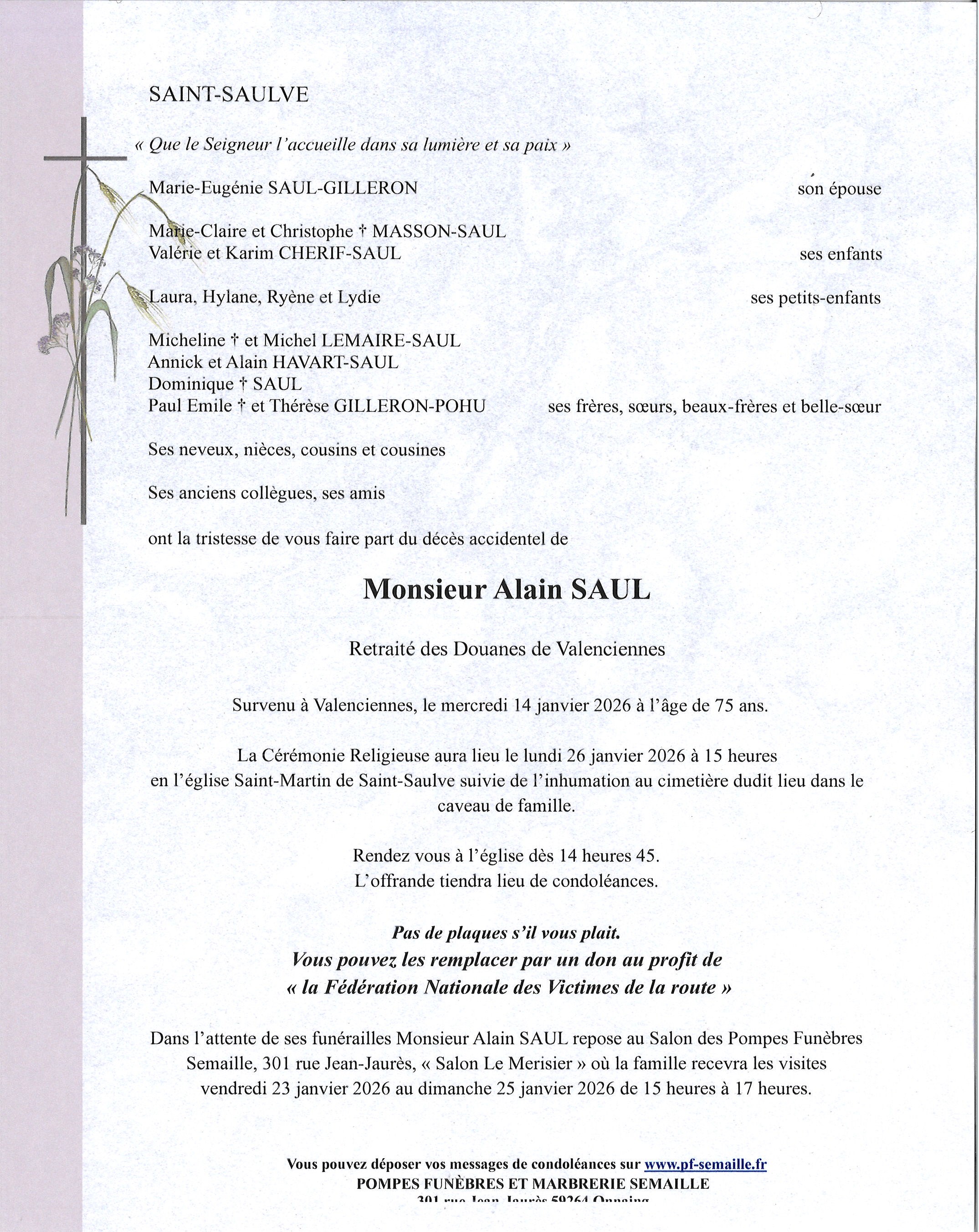 Cette page vous permet de présenter vos condoléances à la famille et de partager l'avis de décès de Alain.