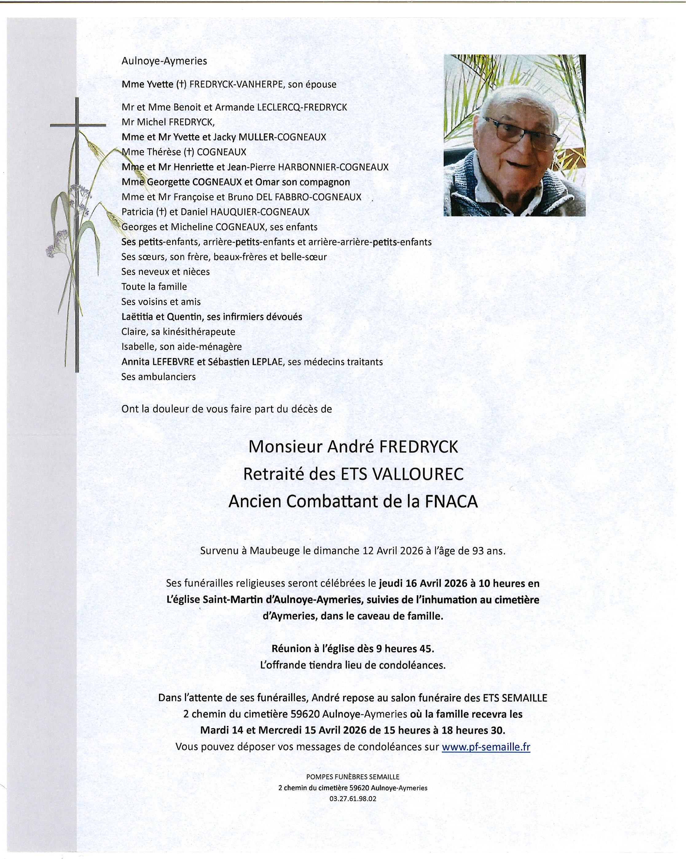 Avis de décès de Monsieur ANDRÉ FREDRYCK