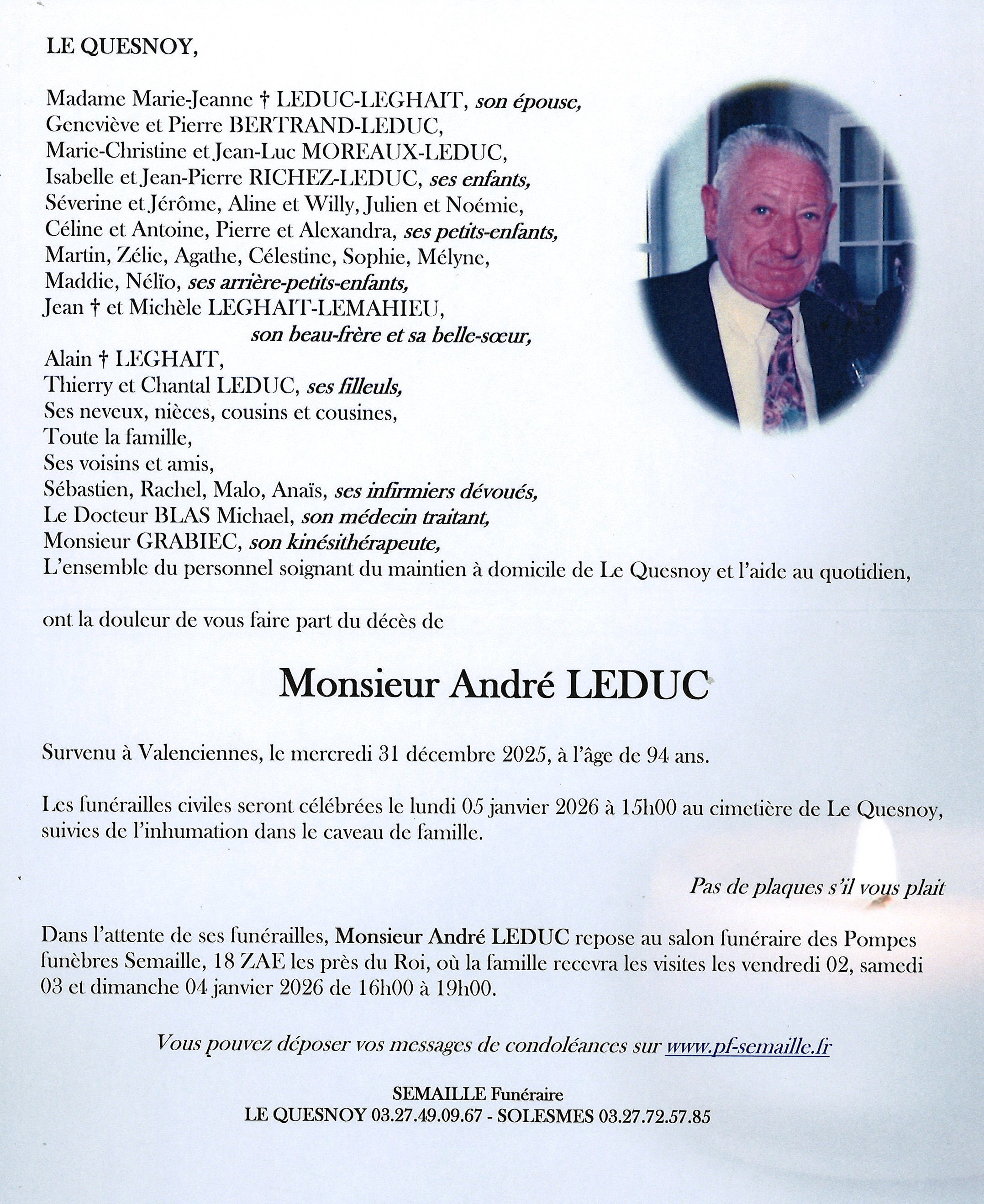 Cette page vous permet de présenter vos condoléances à la famille et de partager l'avis de décès de André.