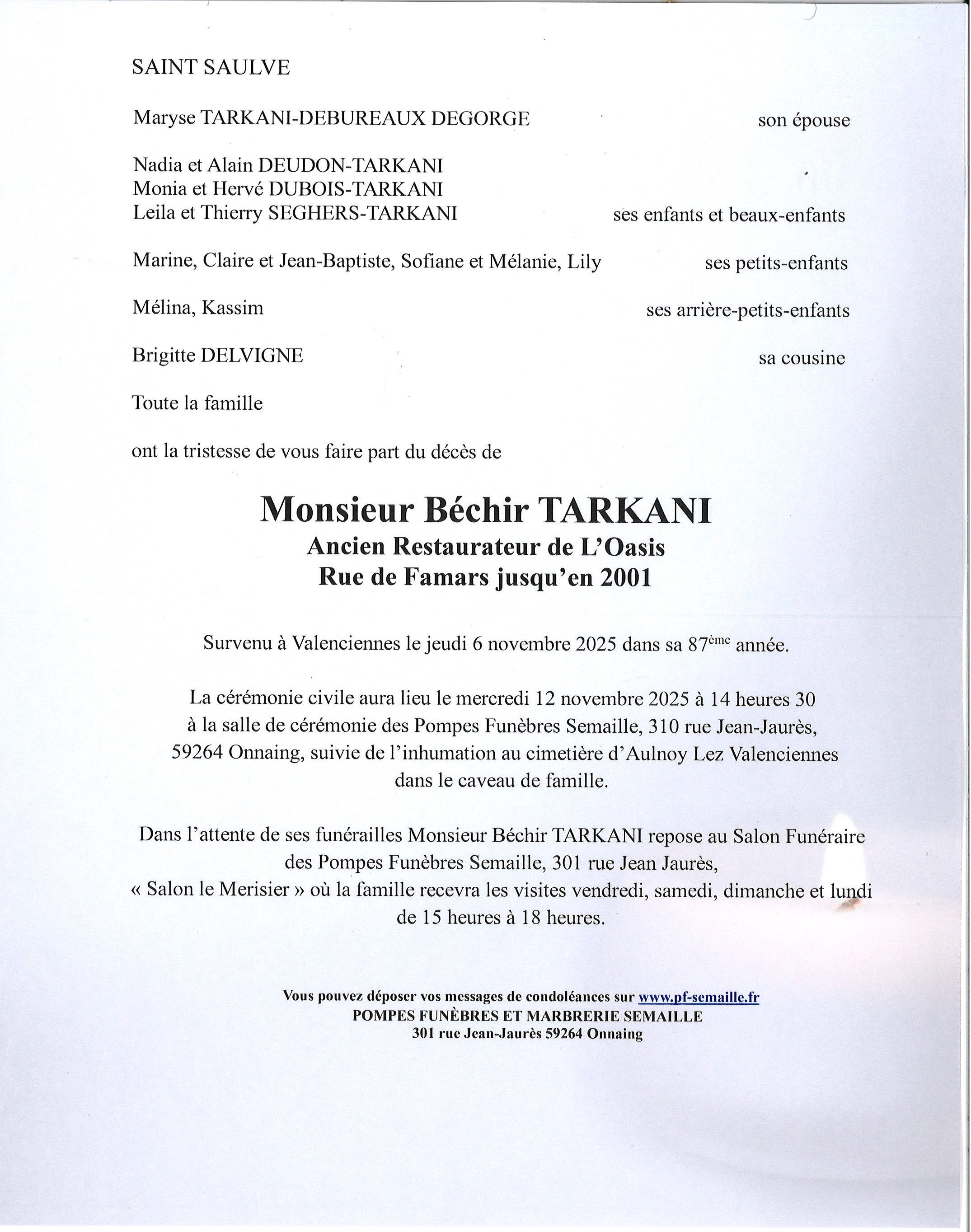 Cette page vous permet de présenter vos condoléances à la famille et de partager l'avis de décès de Béchir.
