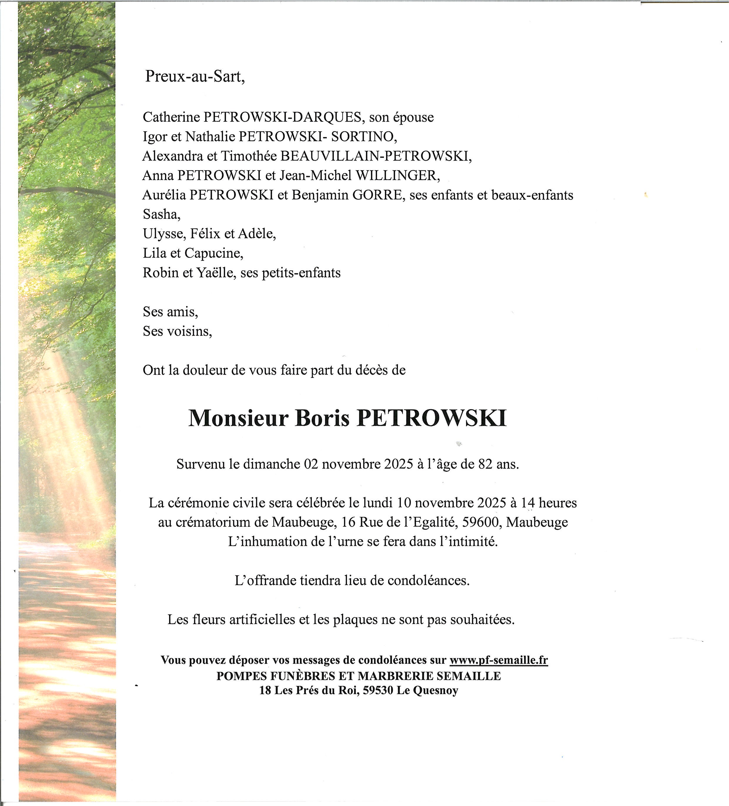 Cette page vous permet de présenter vos condoléances à la famille et de partager l'avis de décès de Boris.