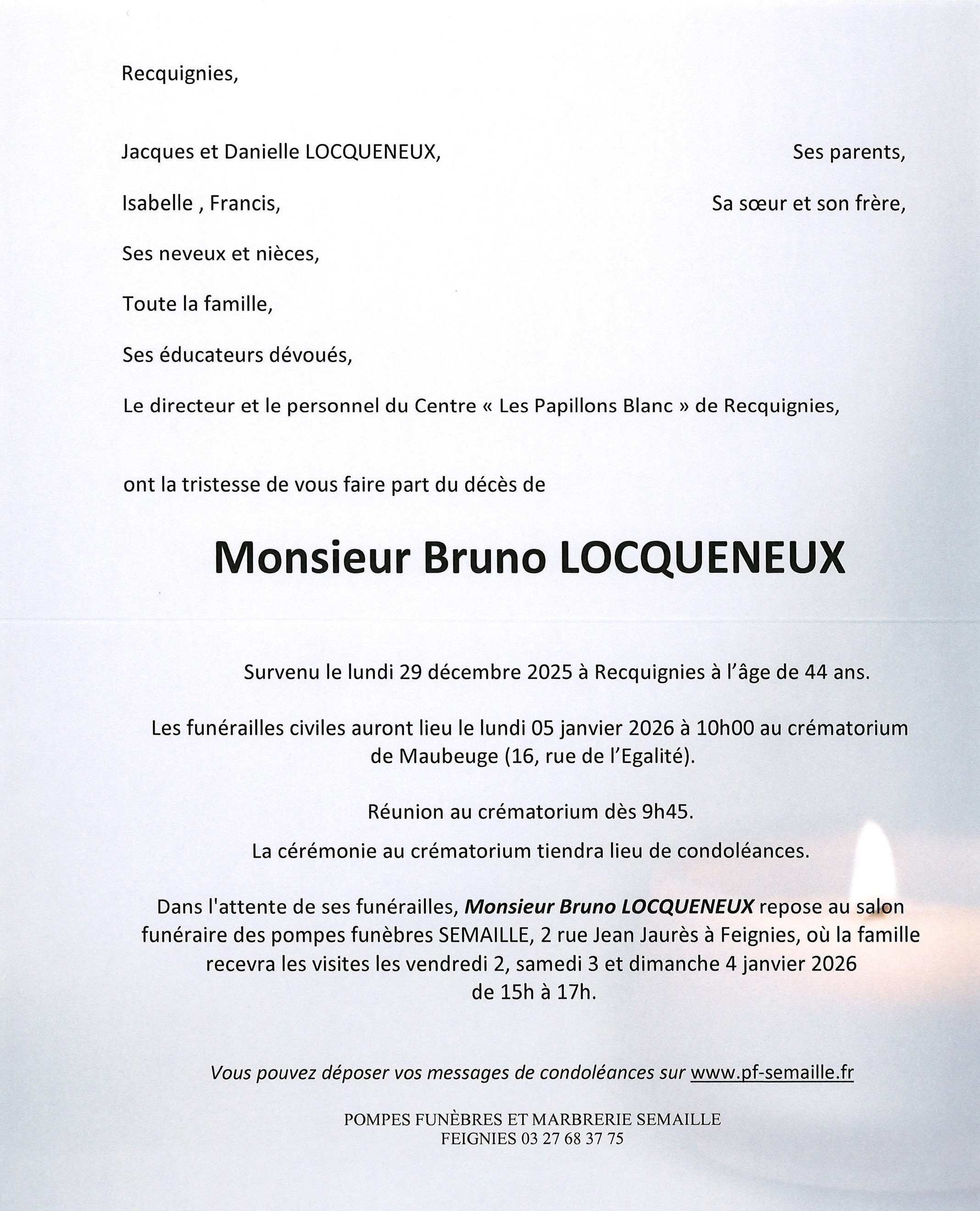 Avis de décès de Monsieur Bruno LOCQUENEUX