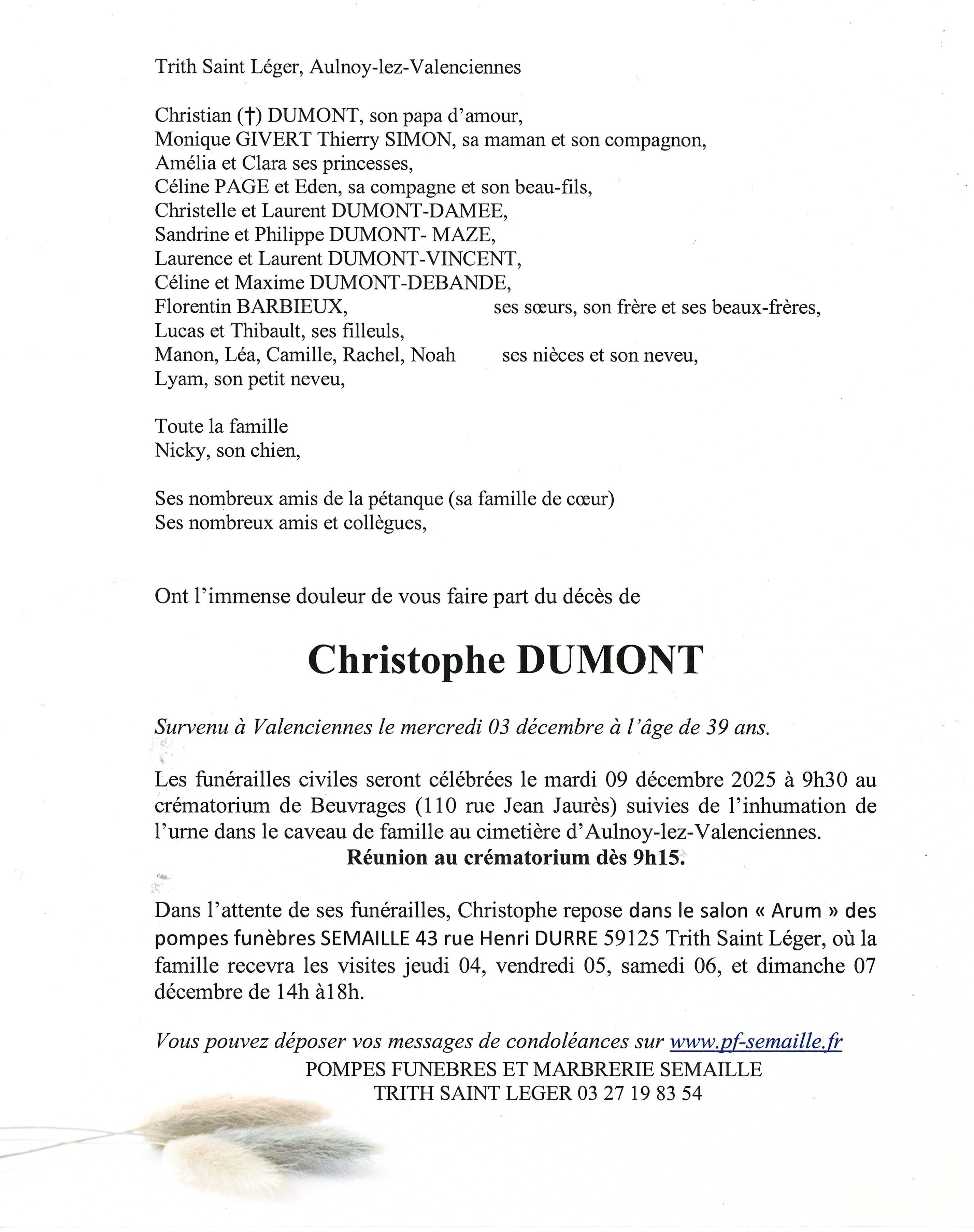 Déroulement des funérailles de Monsieur Christophe DUMONT