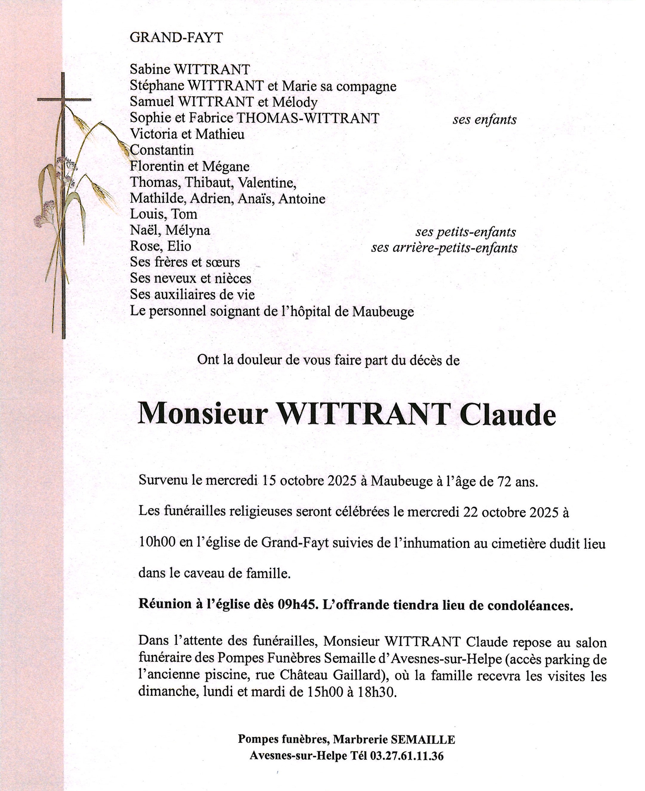 Avis de décès de Monsieur CLAUDE WITTRANT