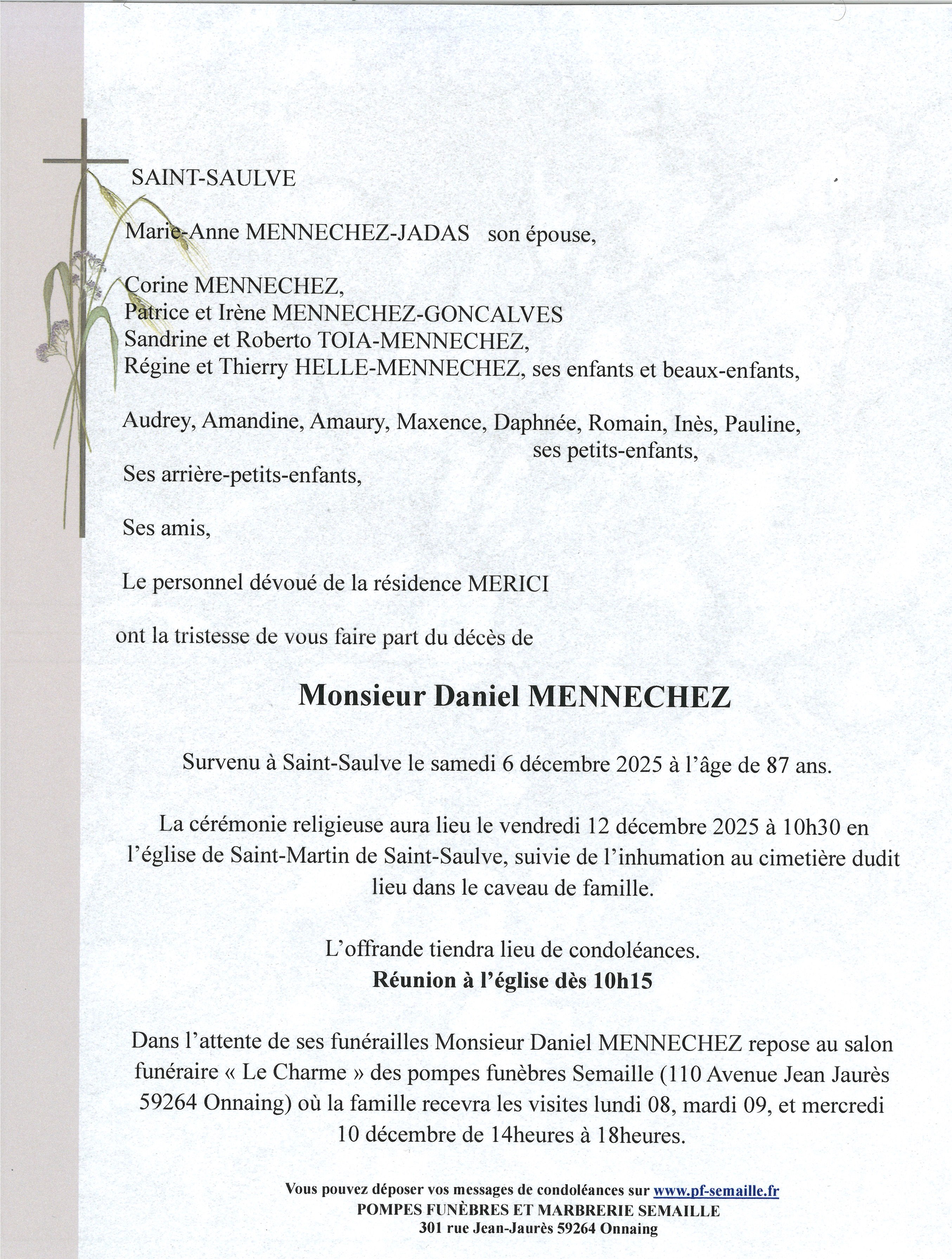 Avis de décès de Monsieur Daniel MENNECHEZ