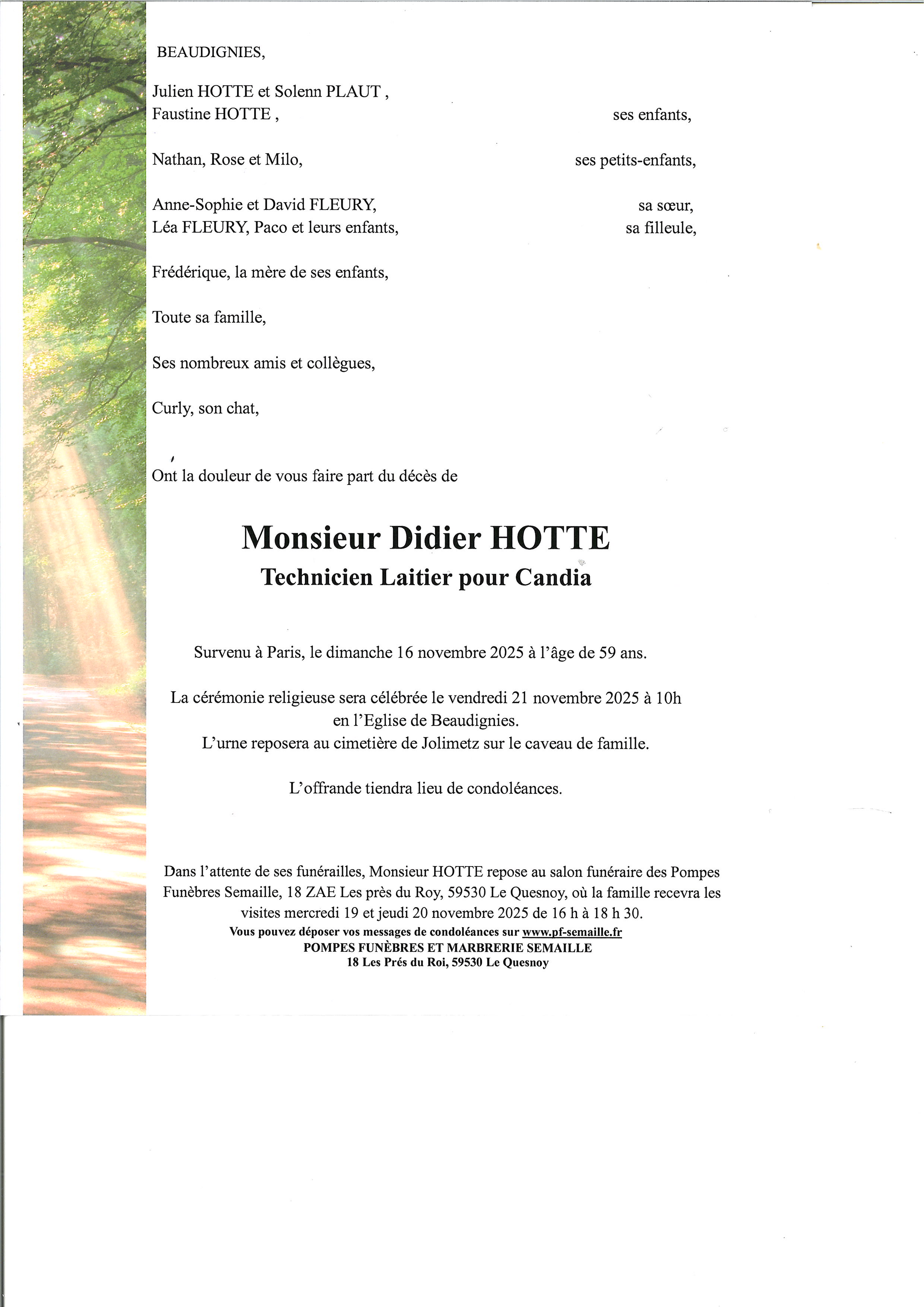 Cette page vous permet de présenter vos condoléances à la famille et de partager l'avis de décès de Didier.