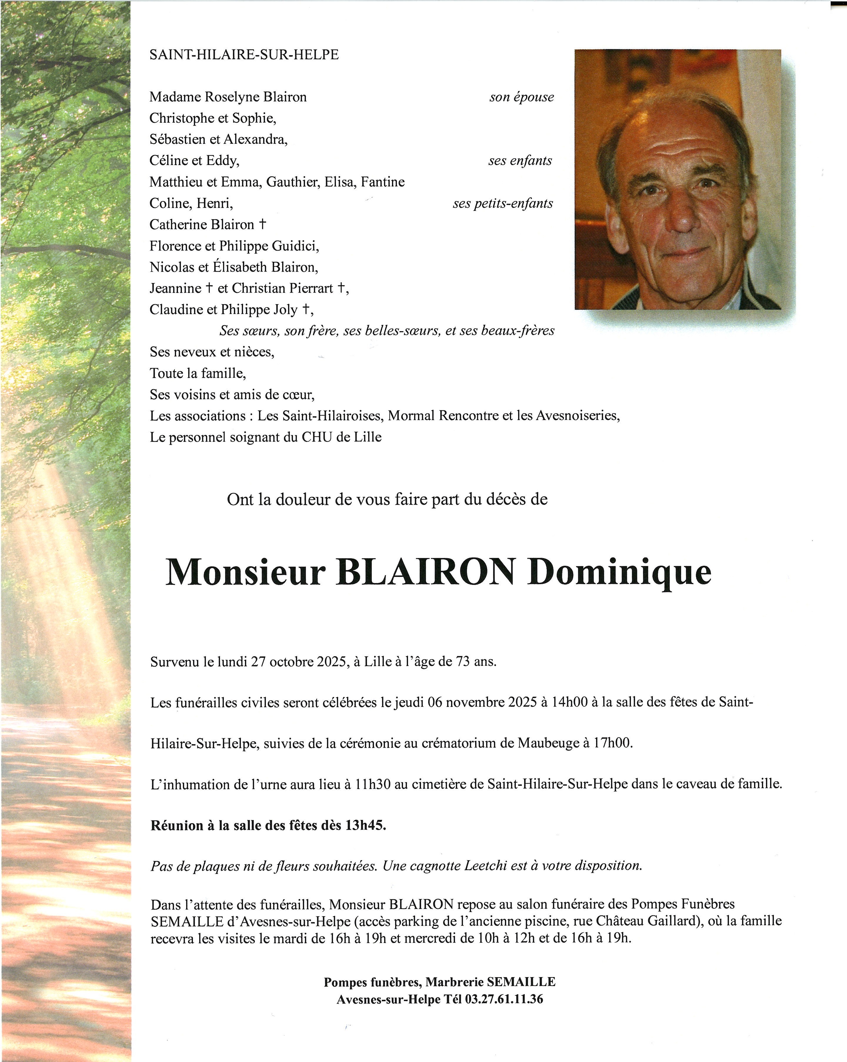 Avis de décès de Monsieur DOMINIQUE BLAIRON
