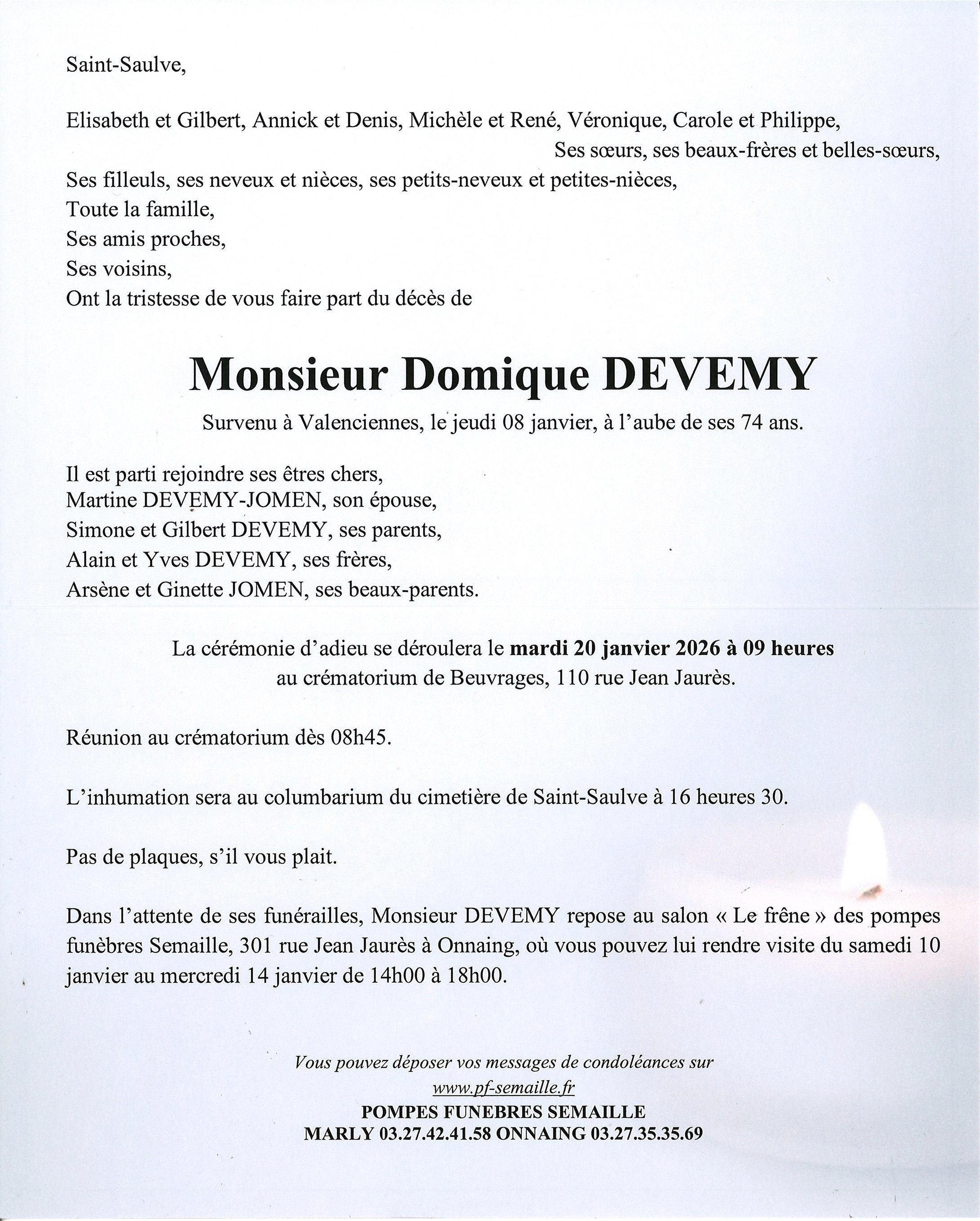 Avis de décès de Monsieur Dominique DEVEMY