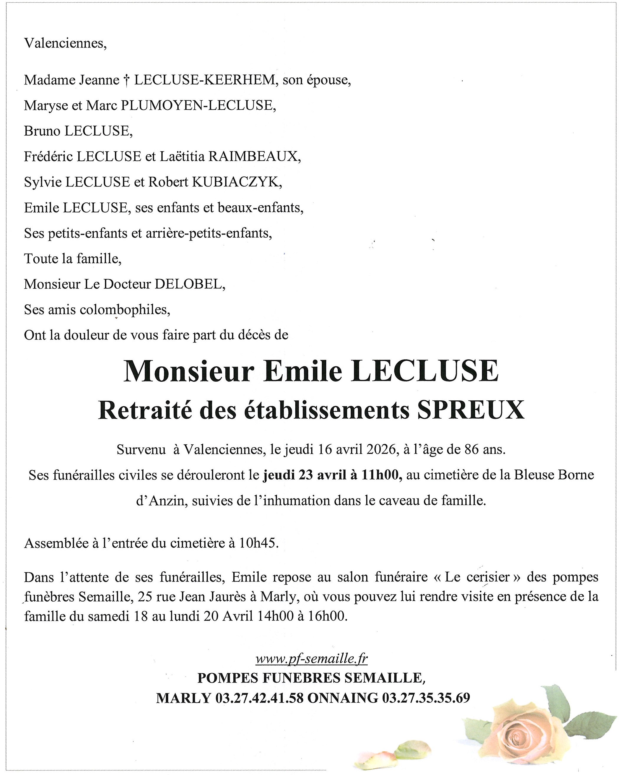 Déroulement des funérailles de Monsieur EMILE LECLUSE