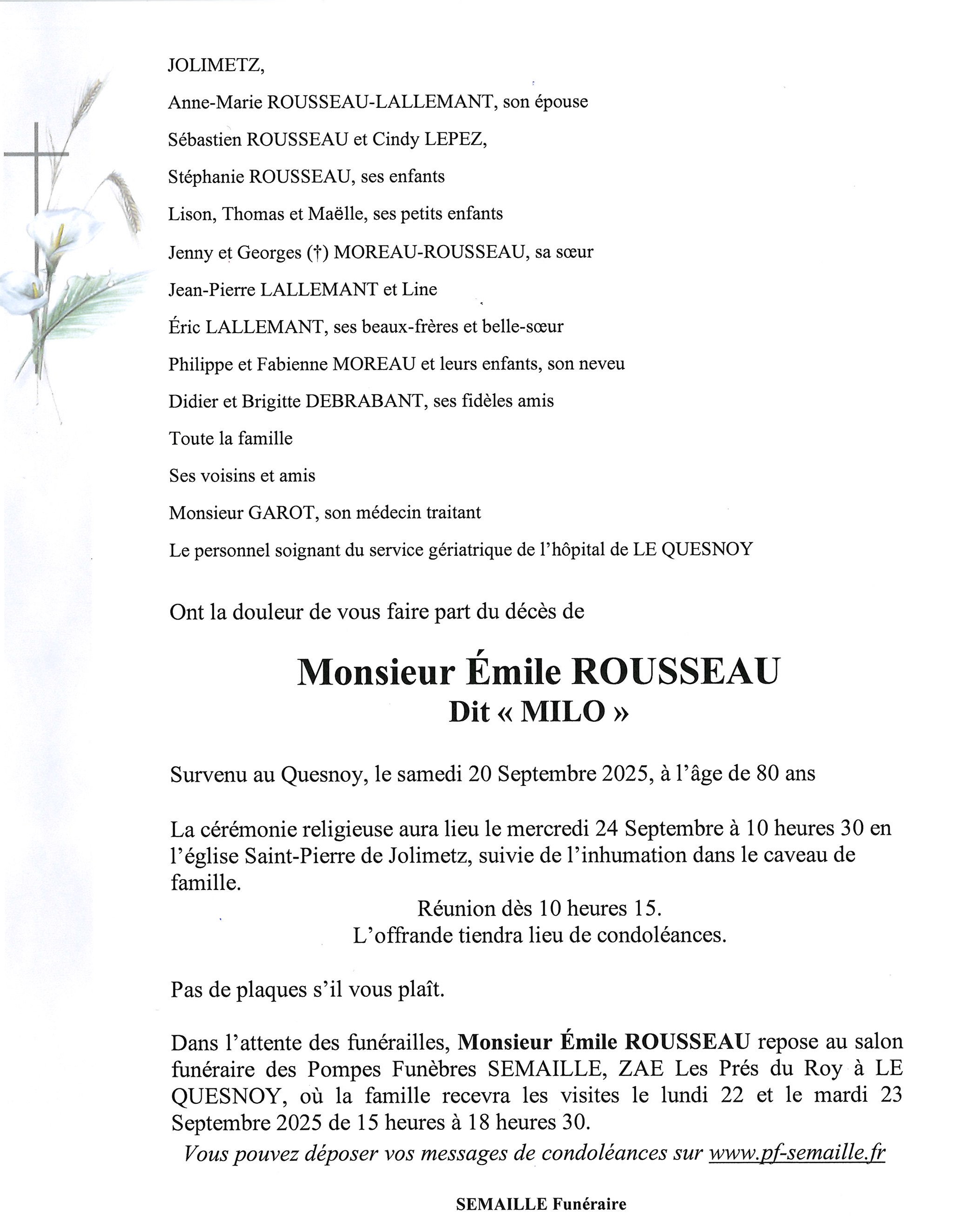 Déroulement des funérailles de Monsieur Émile ROUSSEAU