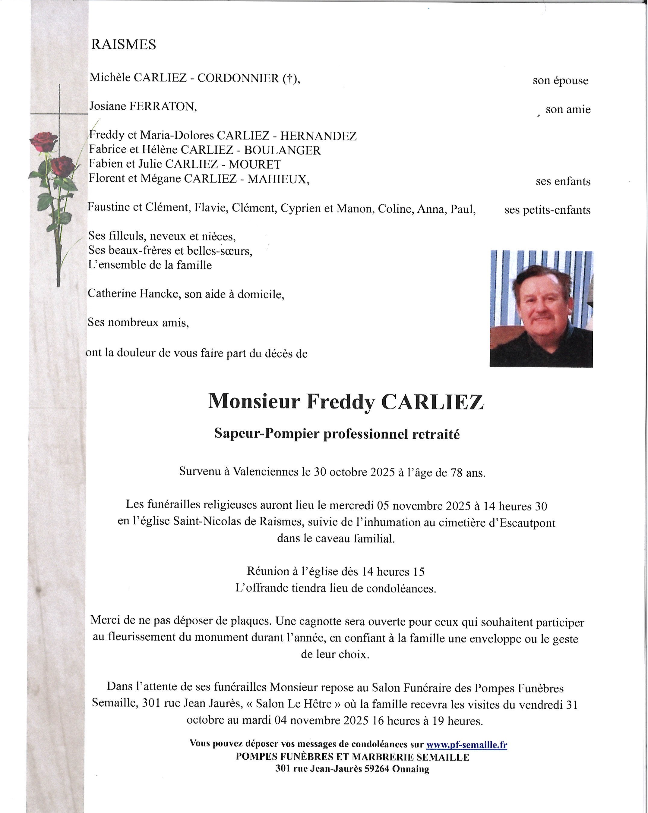 Avis de décès de Monsieur Freddy CARLIEZ