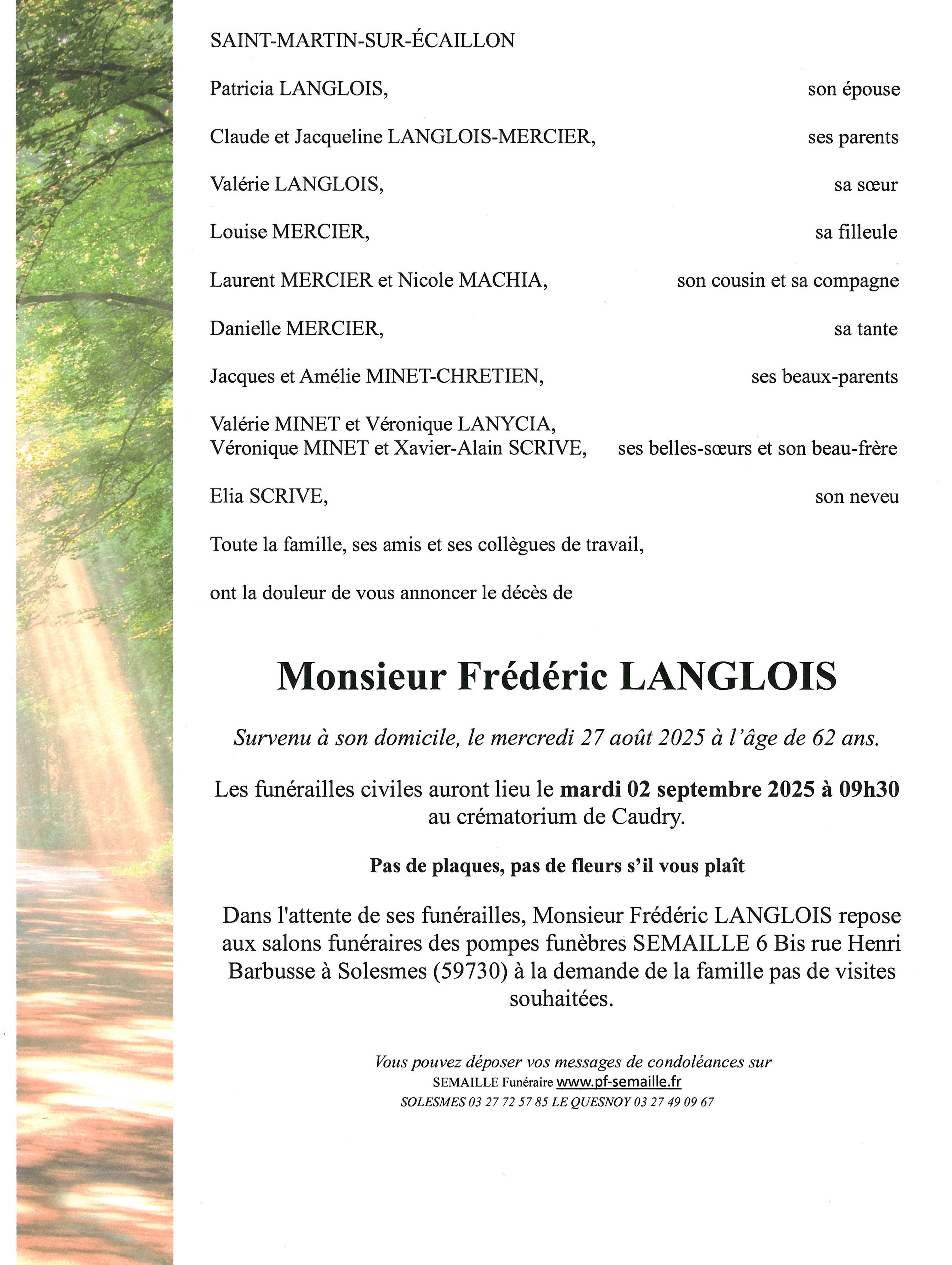 Avis de décès de Monsieur Frédéric LANGLOIS