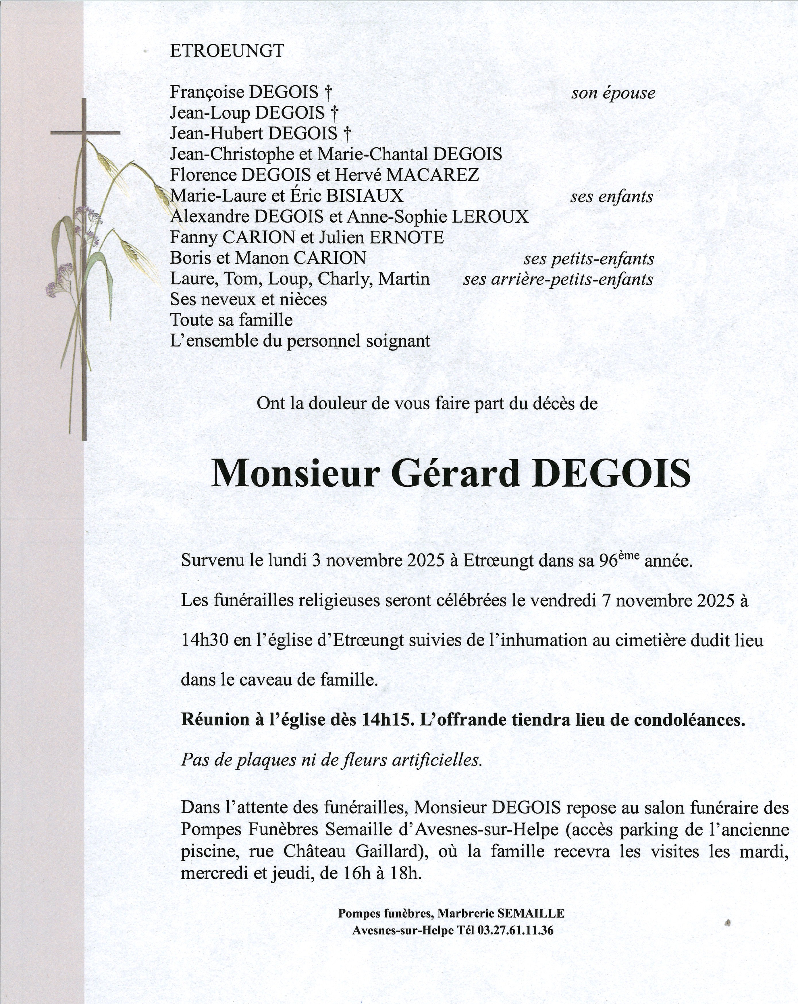 Déroulement des funérailles de Monsieur Gérard DEGOIS