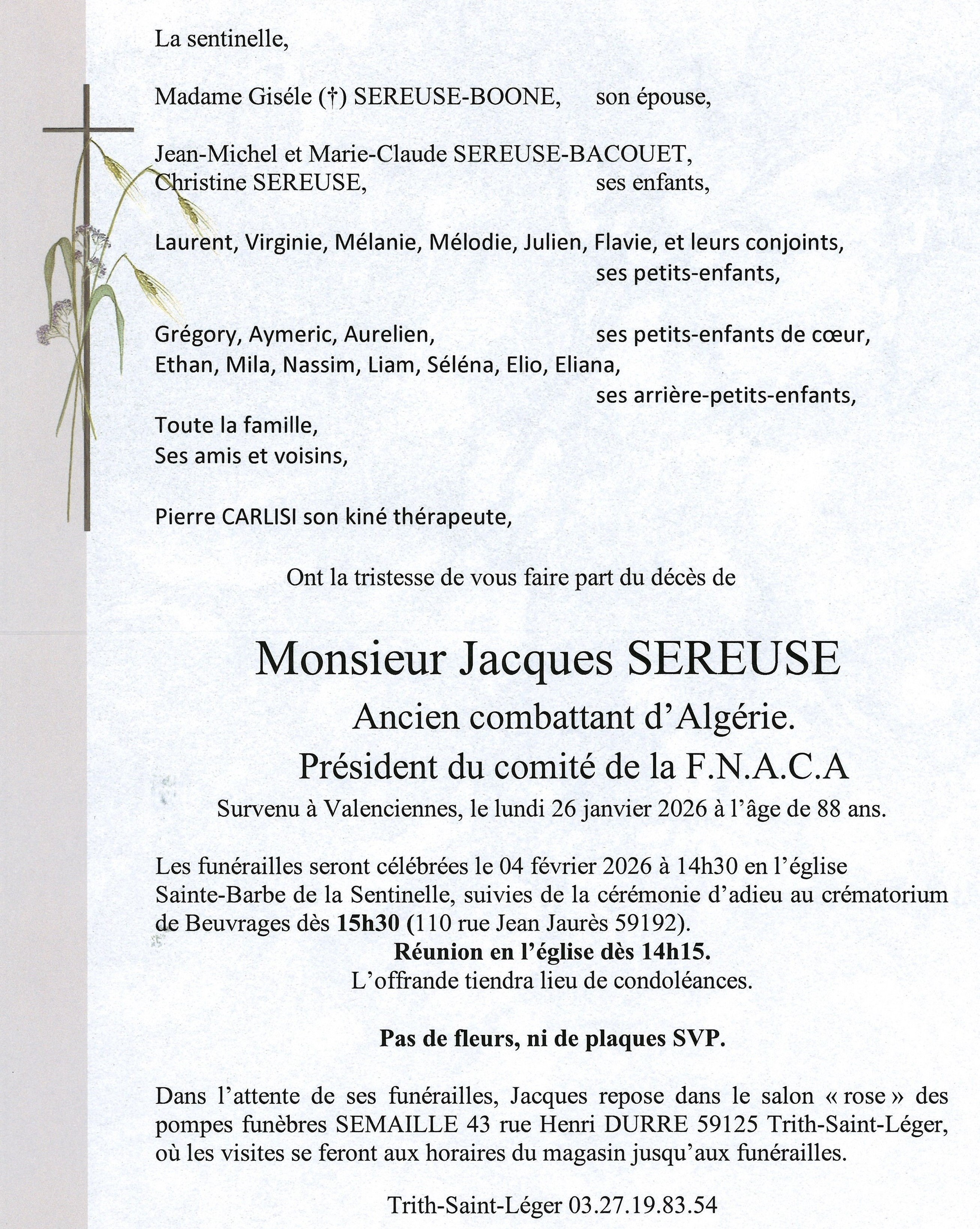 Déroulement des funérailles de Monsieur Jacques SEREUSE