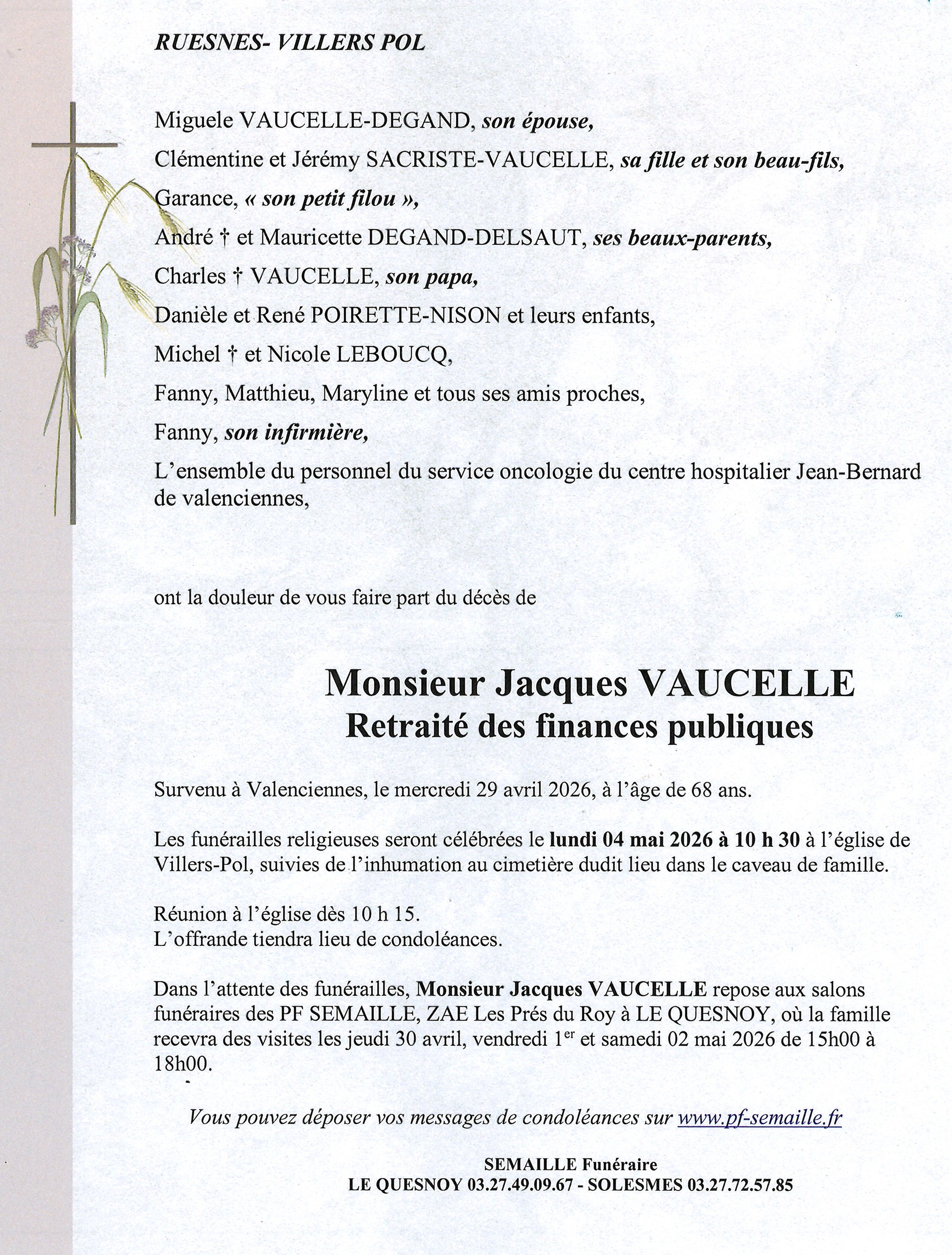 Avis de décès de Monsieur Jacques VAUCELLE