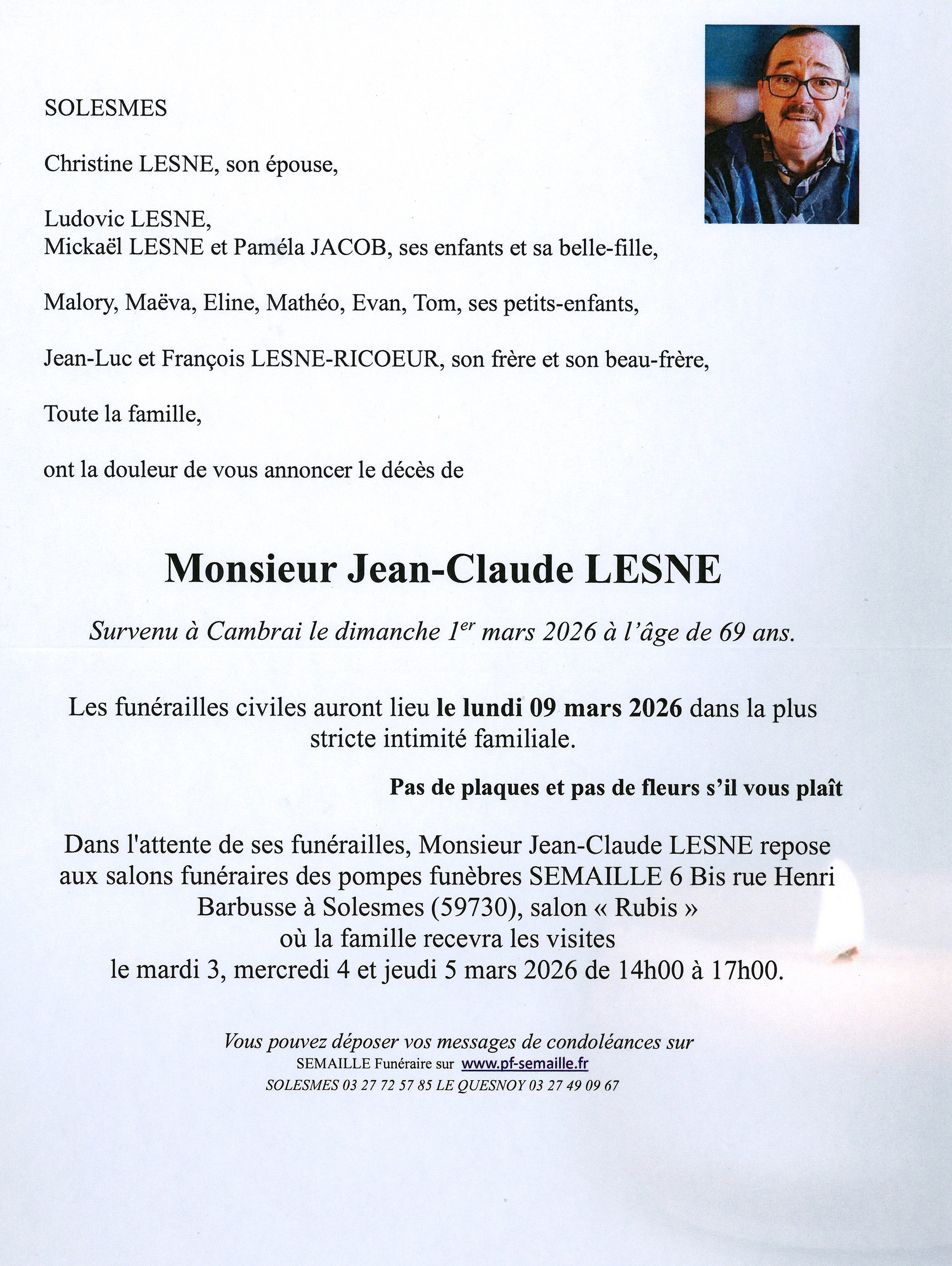 Avis de décès de Monsieur Jean-Claude LESNE