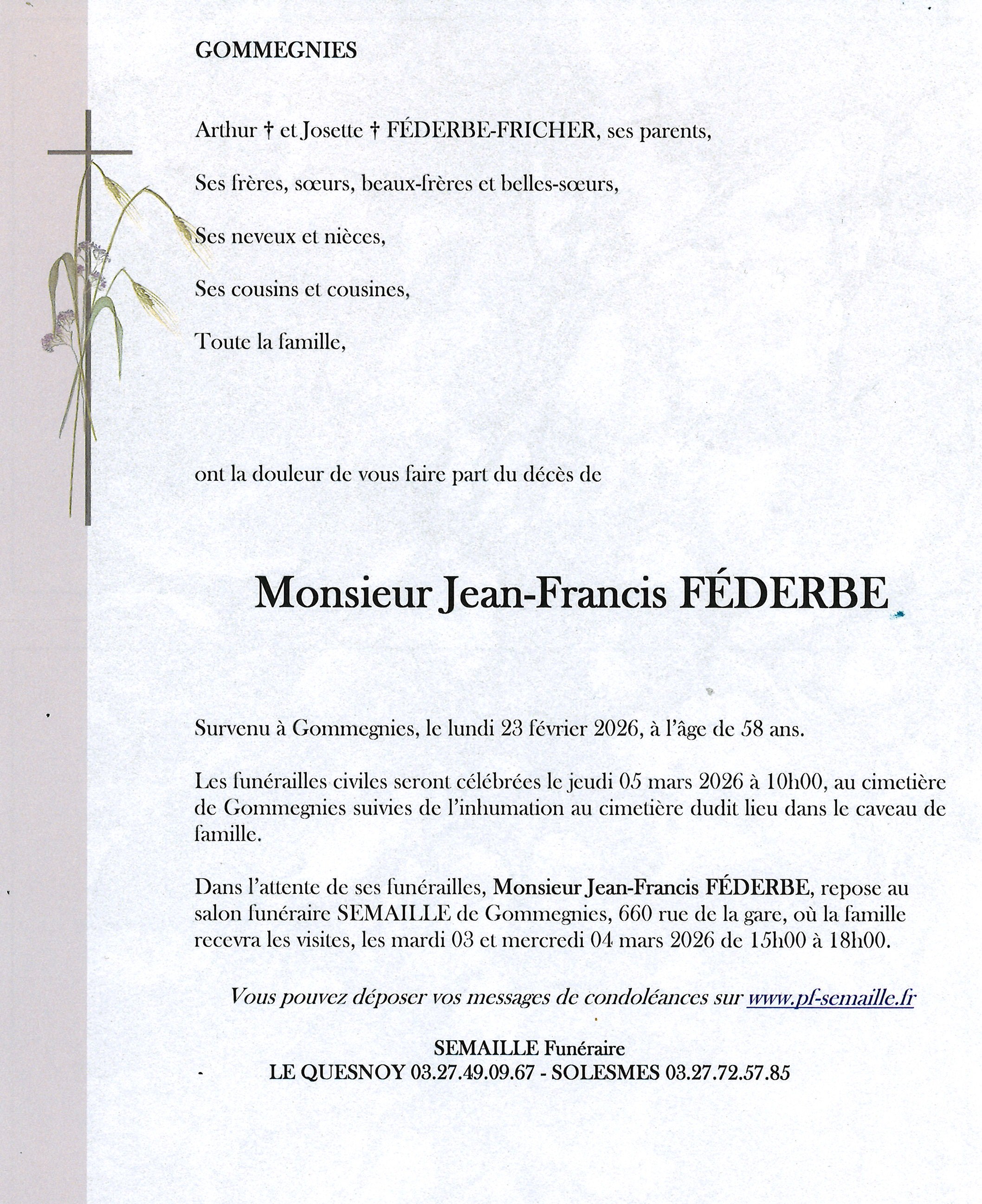 Avis de décès de Monsieur Jean-Francis FÉDERBE