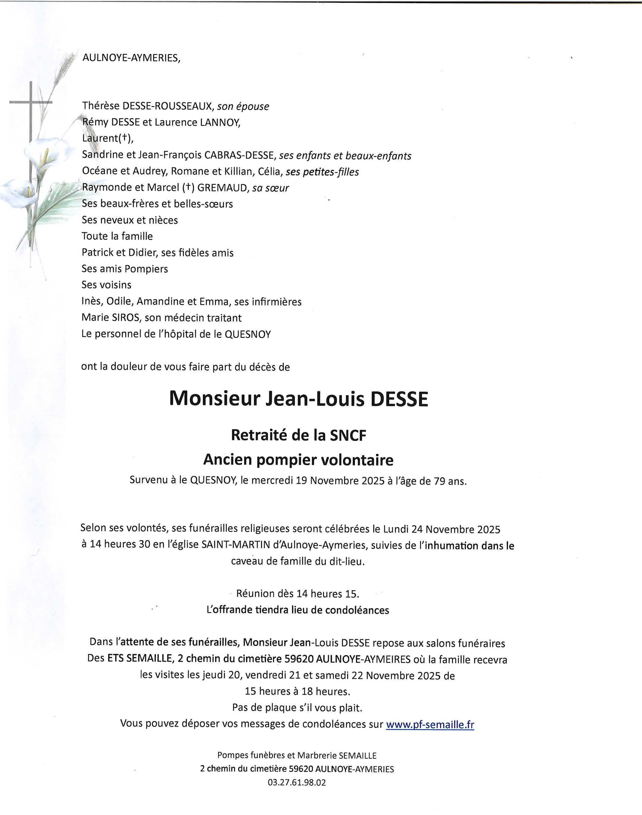 Déroulement des funérailles de Monsieur Jean-Louis DESSE