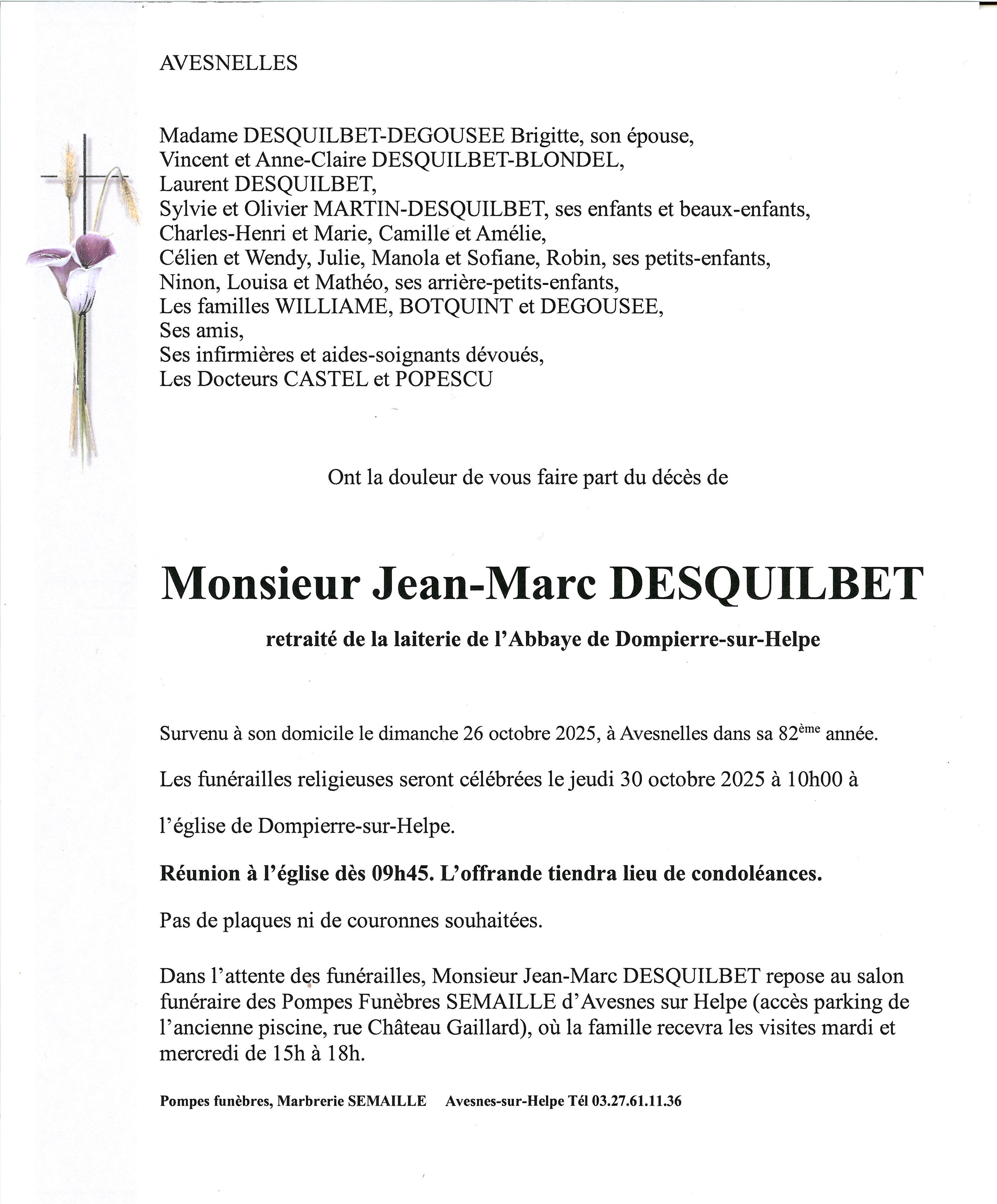 Avis de décès de Monsieur JEAN-MARC DESQUILBET