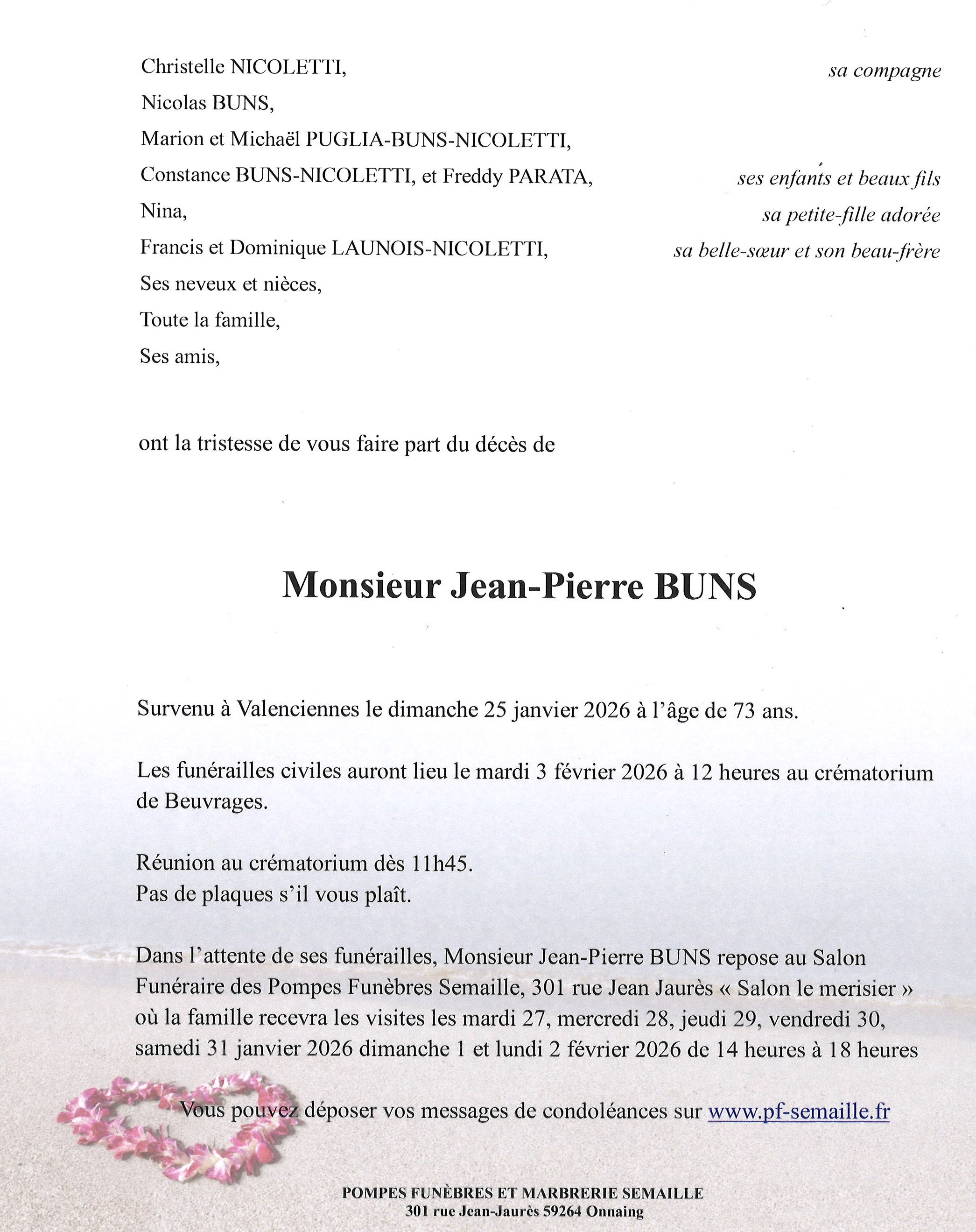 Avis de décès de Monsieur Jean-Pierre BUNS