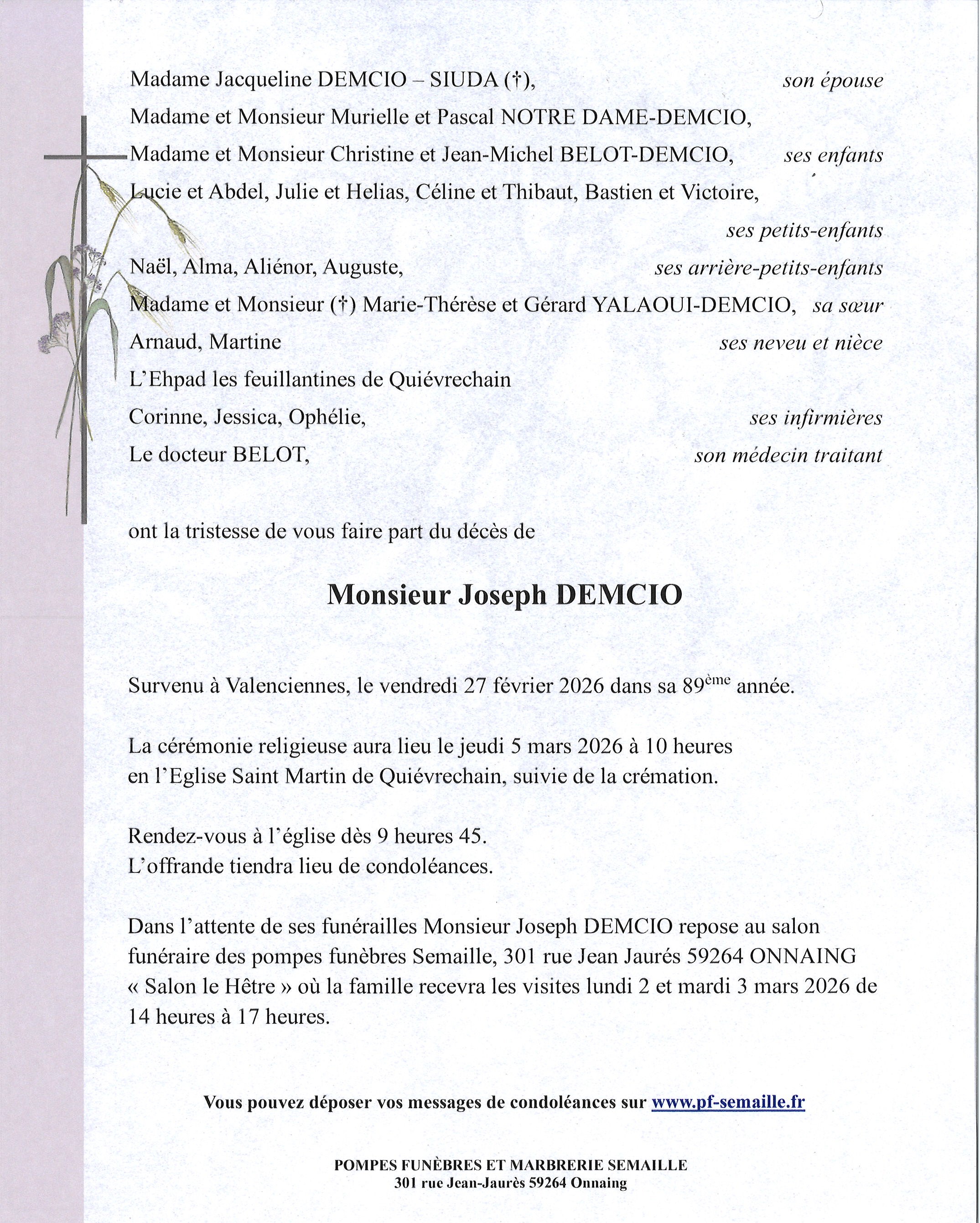 Déroulement des funérailles de Monsieur Joseph DEMCIO