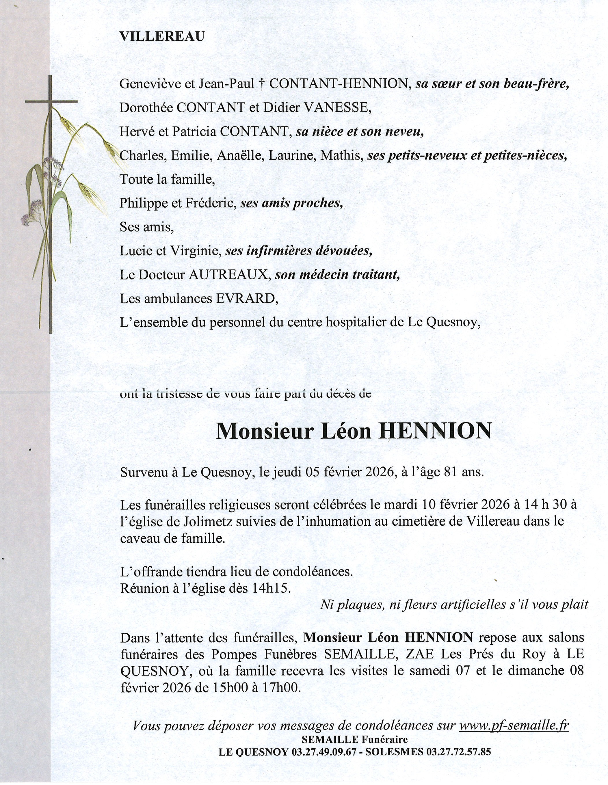 Avis de décès de Monsieur Léon HENNION
