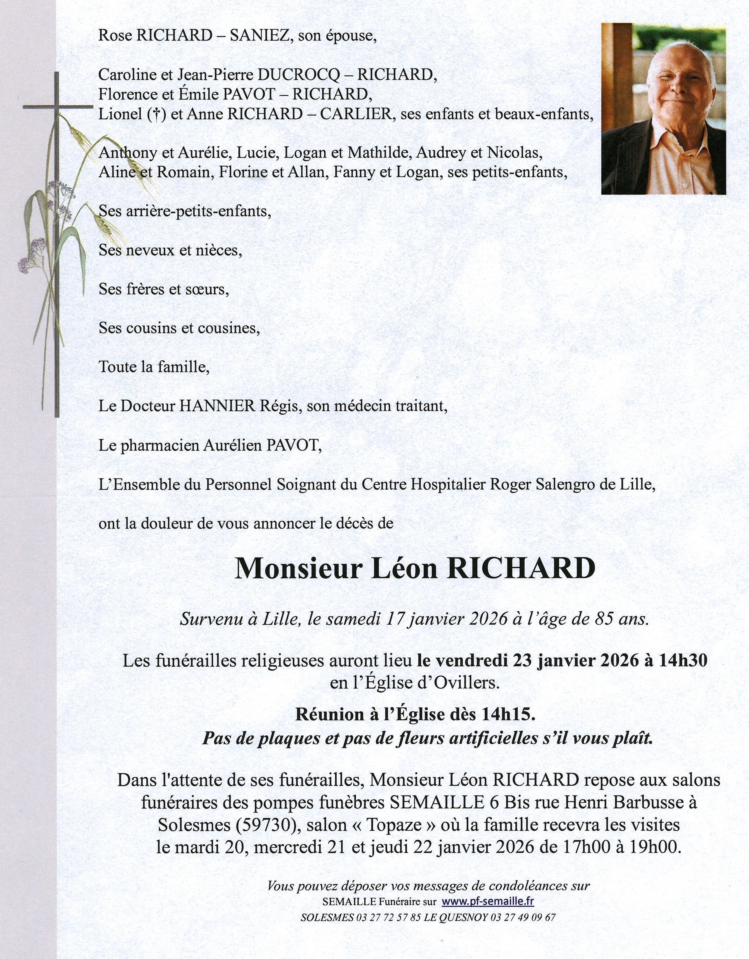 Cette page vous permet de présenter vos condoléances à la famille et de partager l'avis de décès de Léon.