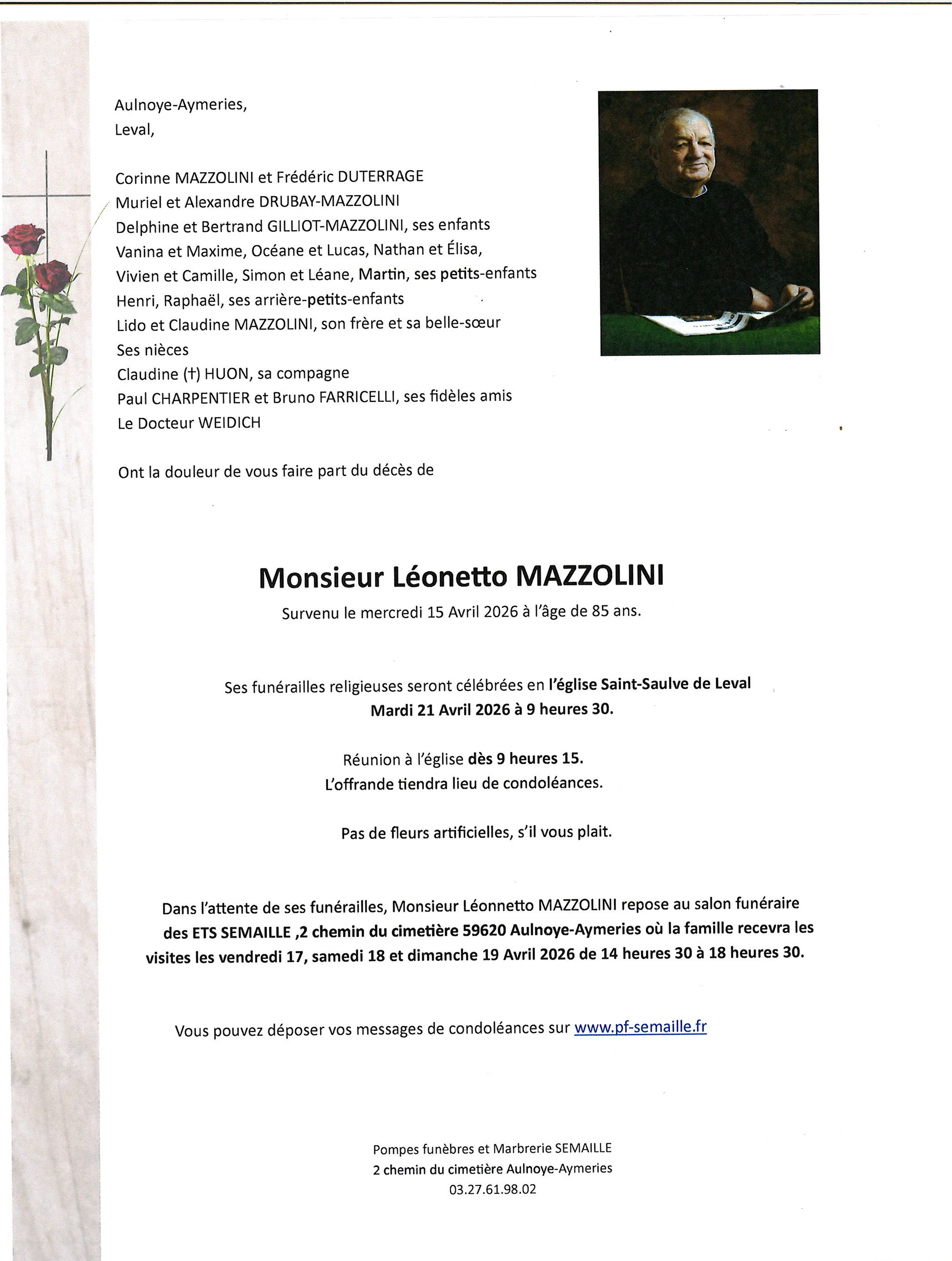 Avis de décès de Monsieur LÉONETTO MAZZOLINI