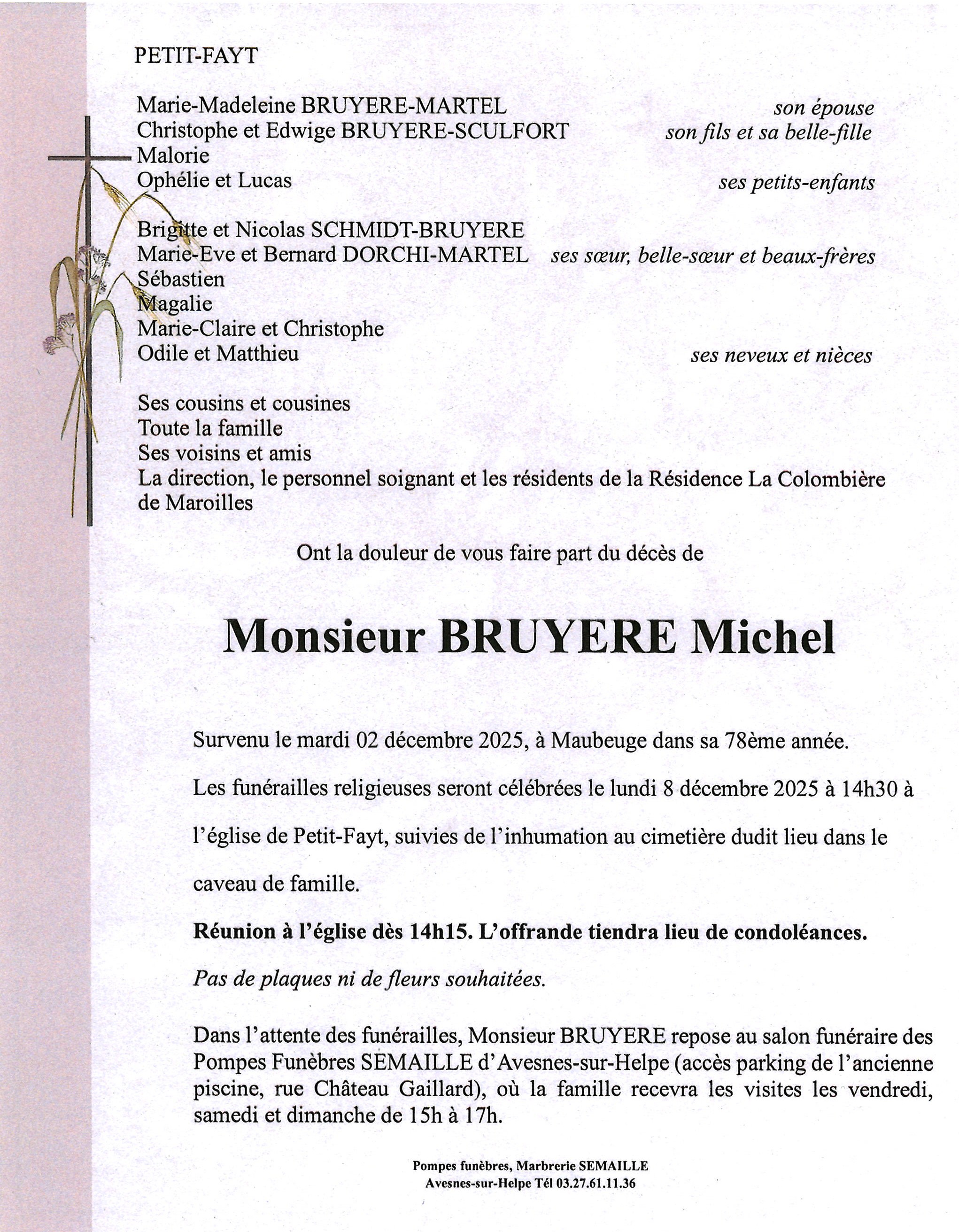 Déroulement des funérailles de Monsieur Michel BRUYERE