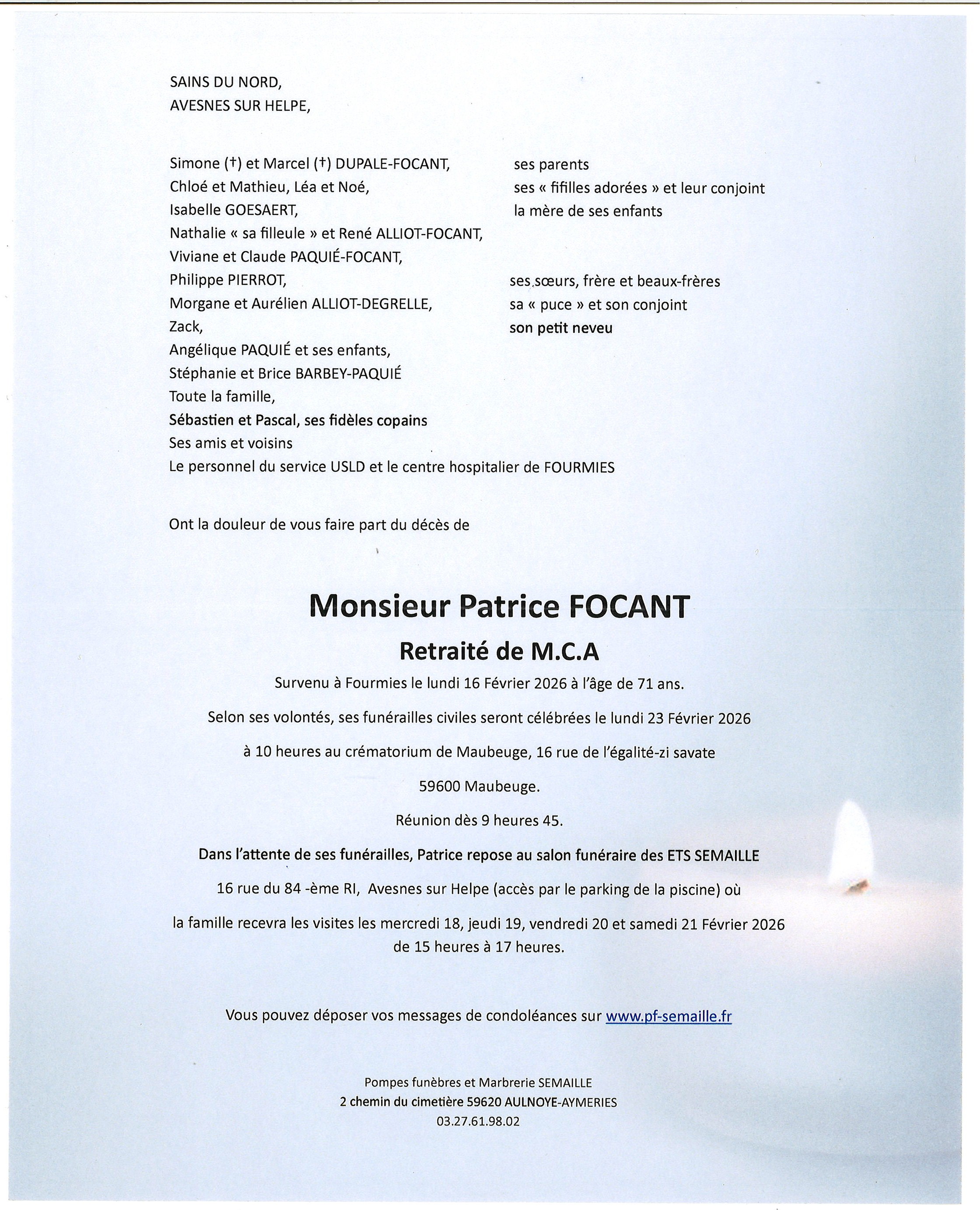 Avis de décès de Monsieur patrice FOCANT
