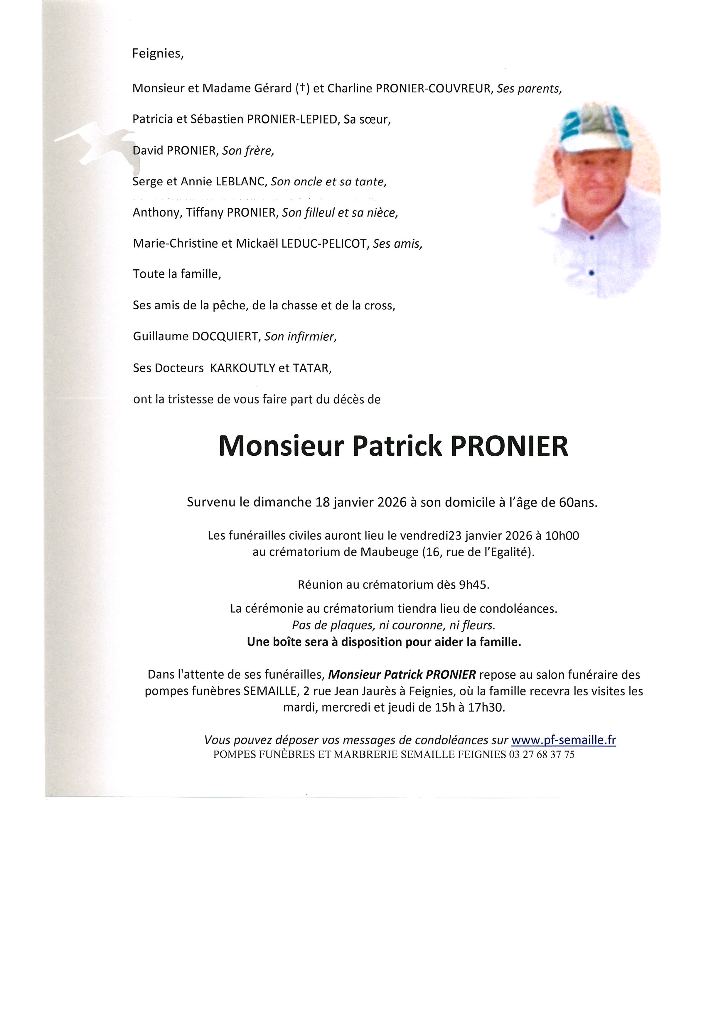 Avis de décès de Monsieur Patrick PRONIER
