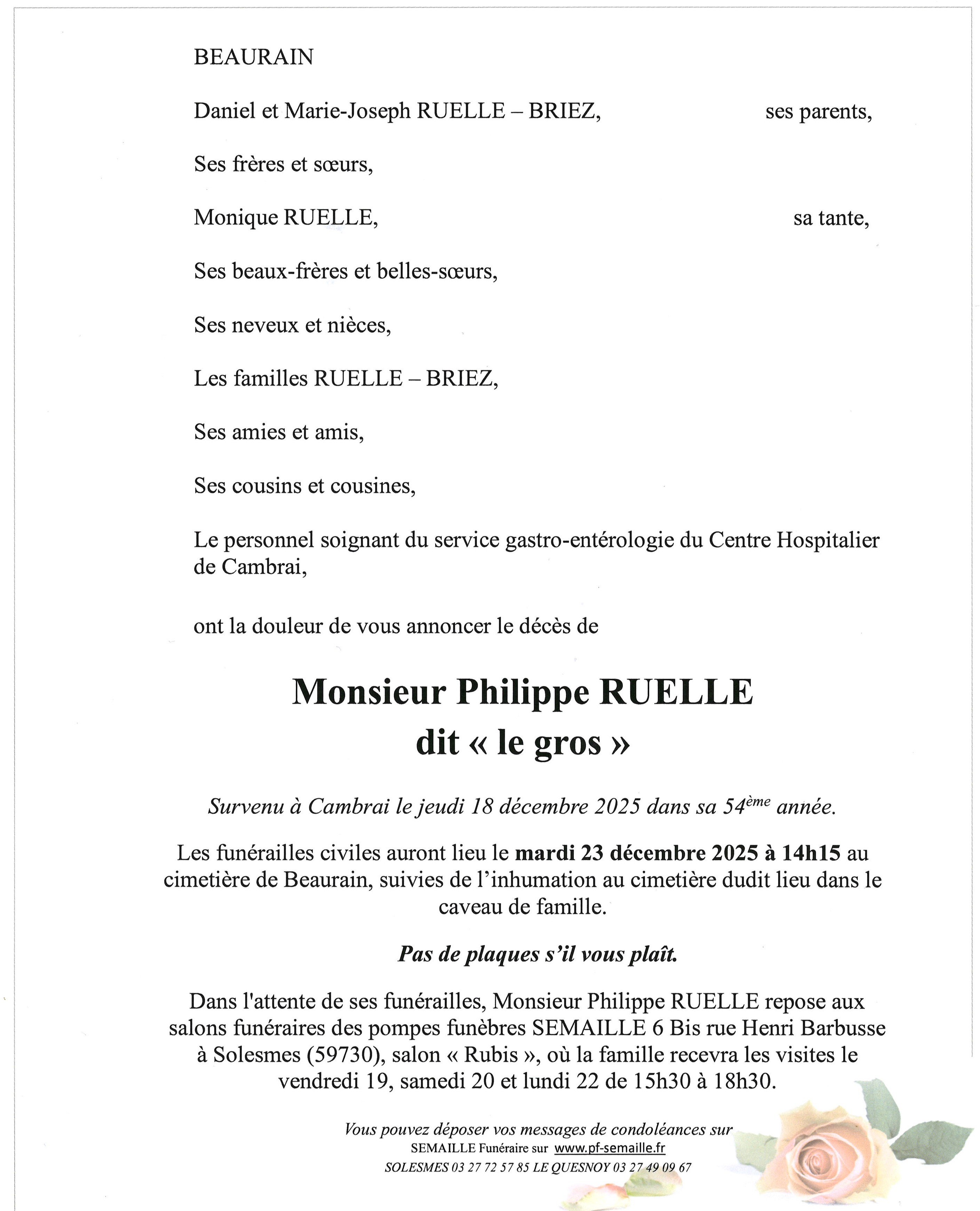 Déroulement des funérailles de Monsieur Philippe RUELLE