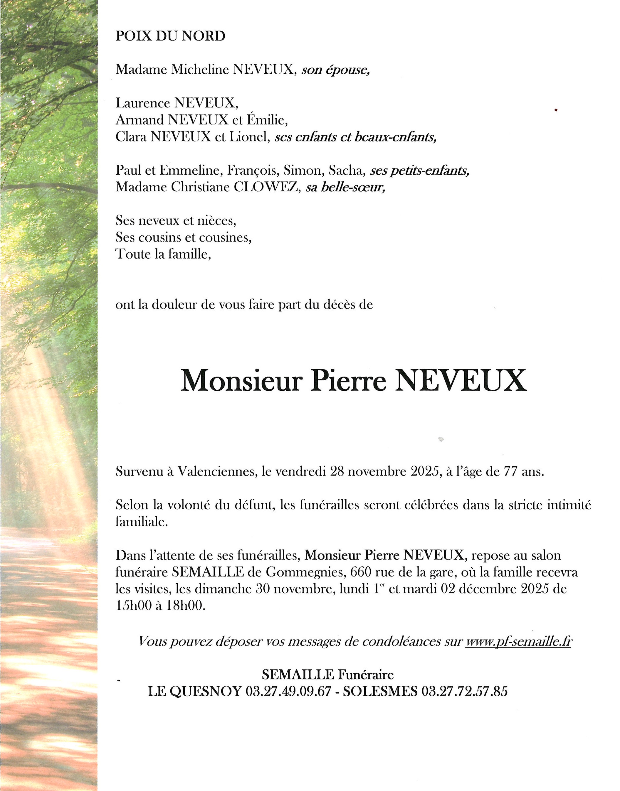 Cette page vous permet de présenter vos condoléances à la famille et de partager l'avis de décès de Pierre.