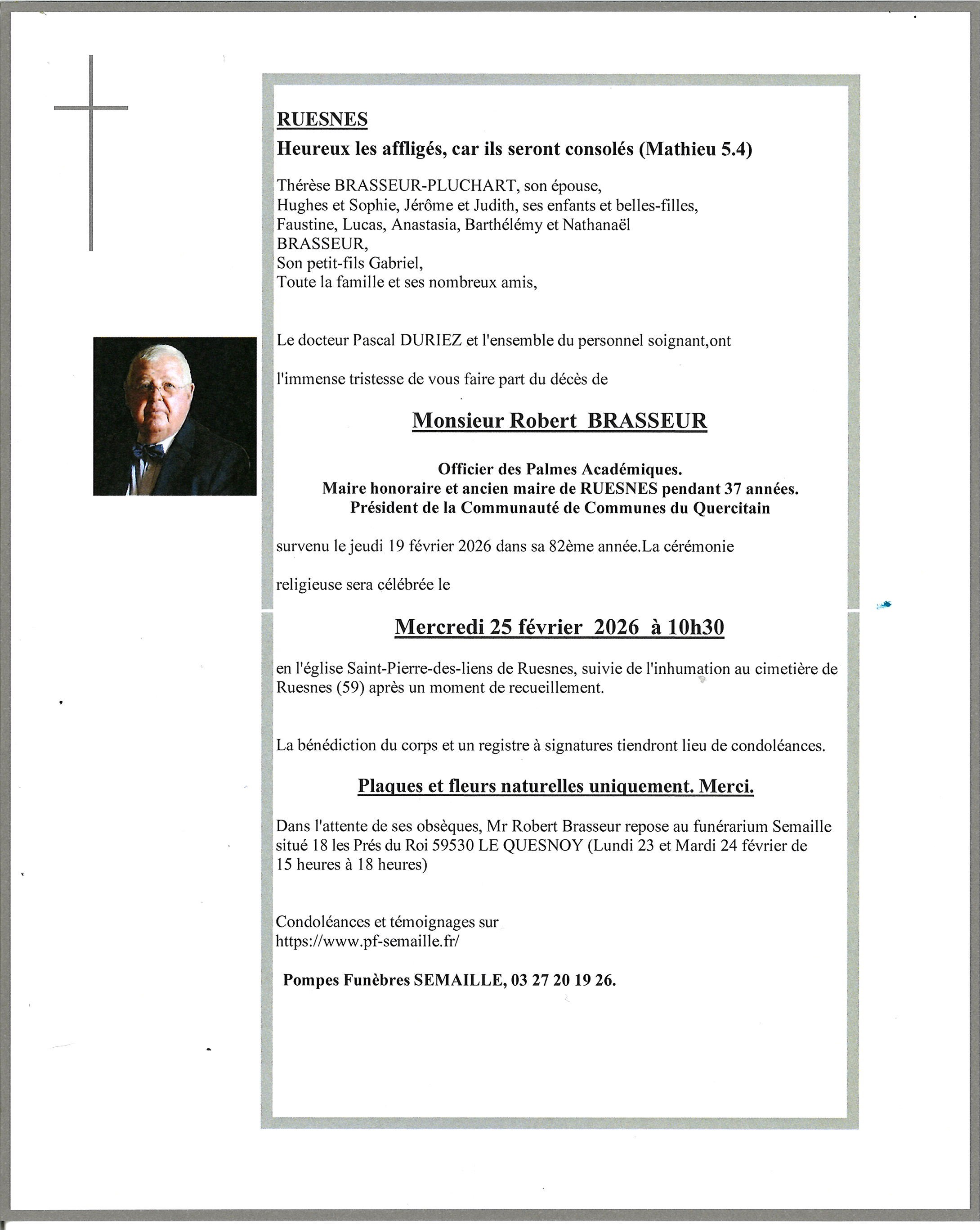 Déroulement des funérailles de Monsieur Robert BRASSEUR