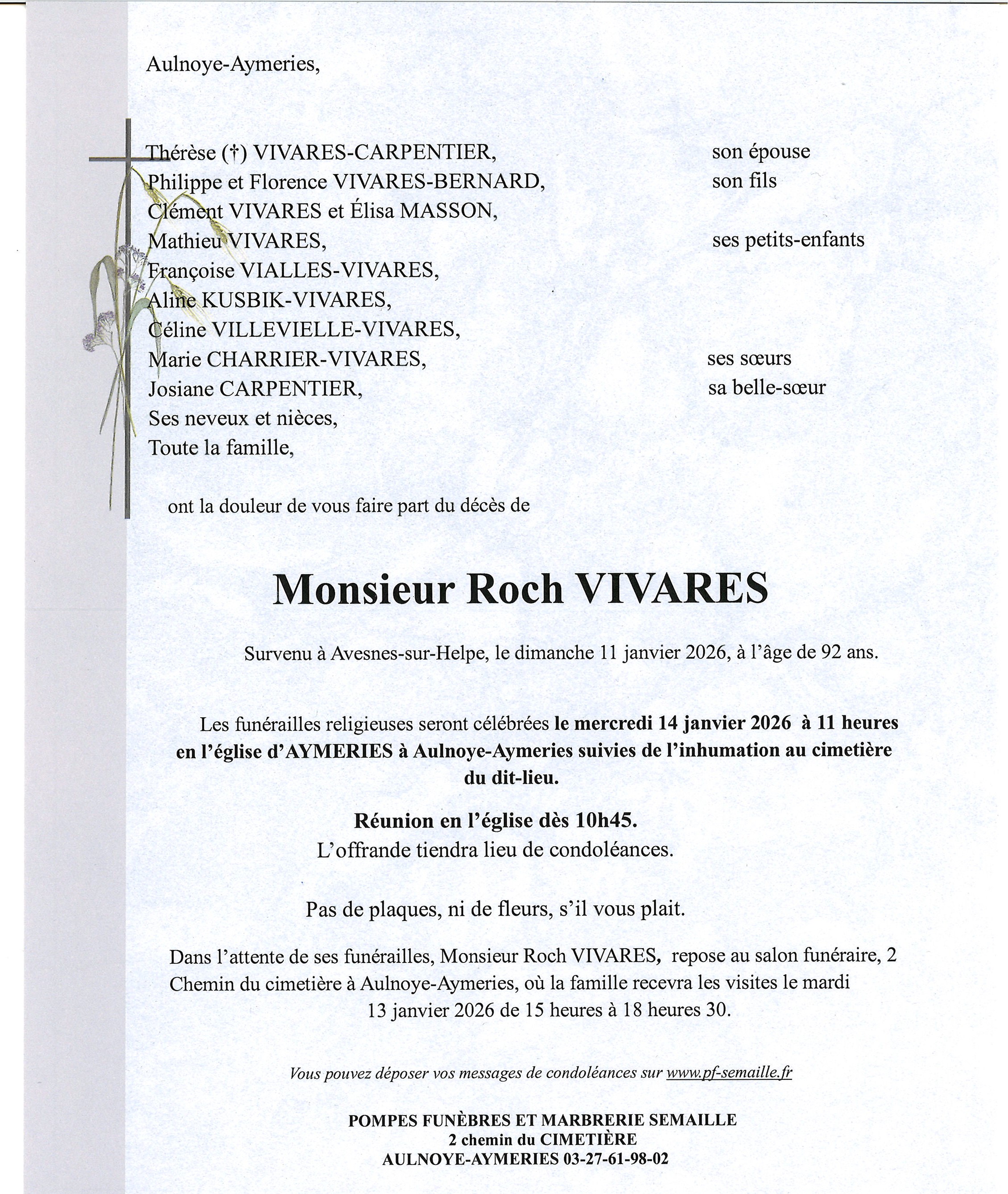 Déroulement des funérailles de Monsieur Roch VIVARES