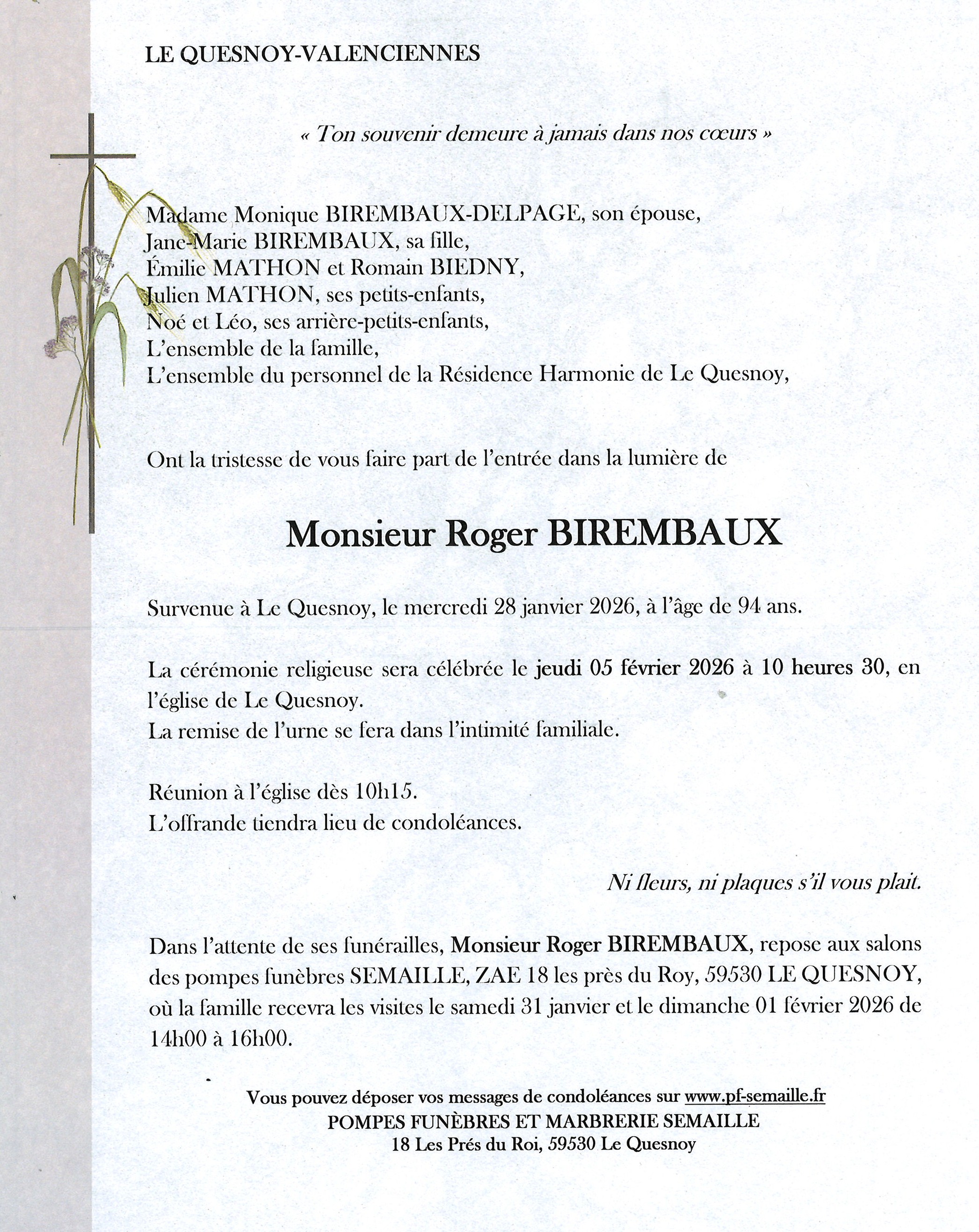 Avis de décès de Monsieur Roger BIREMBAUX
