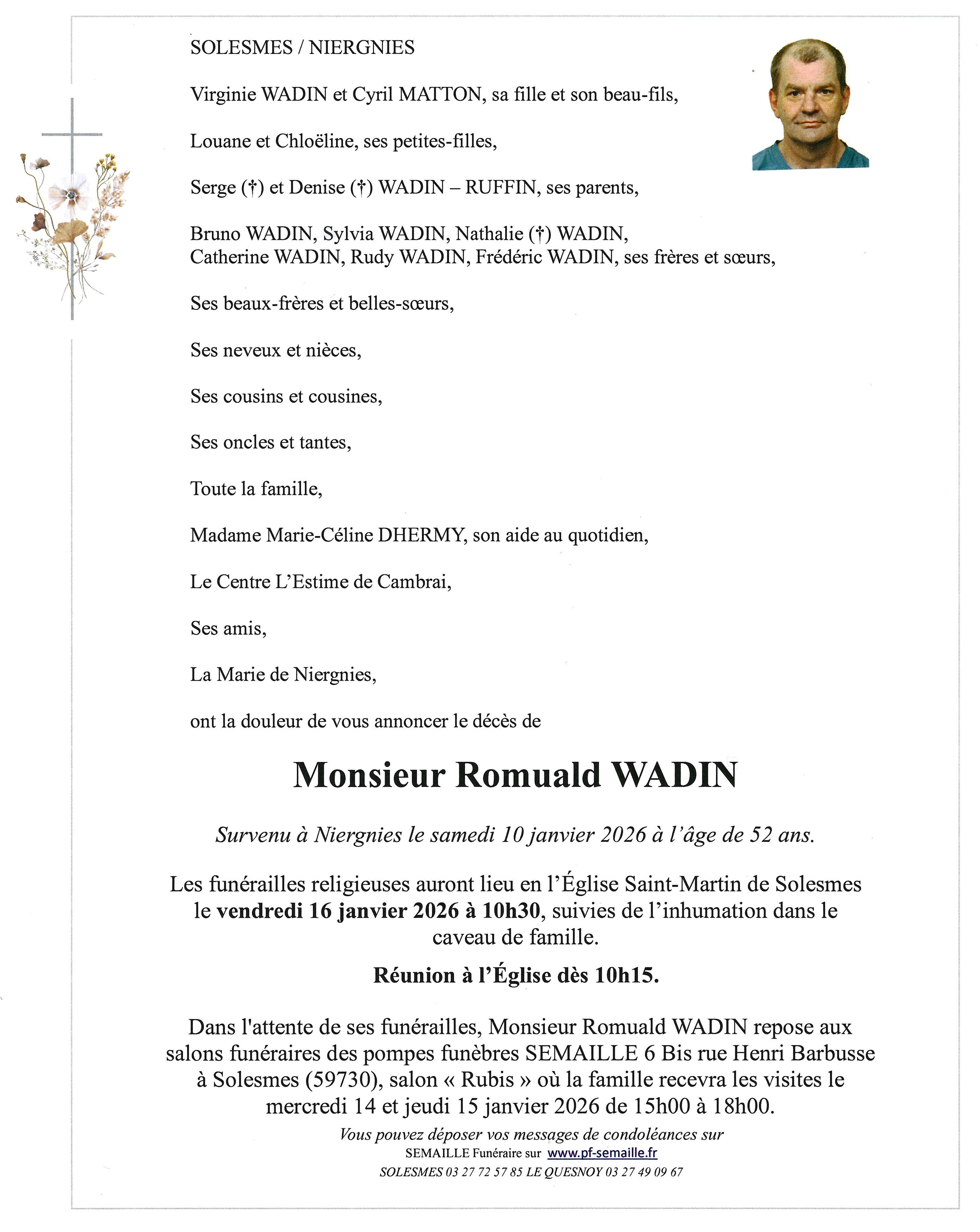 Cette page vous permet de présenter vos condoléances à la famille et de partager l'avis de décès de Romuald.