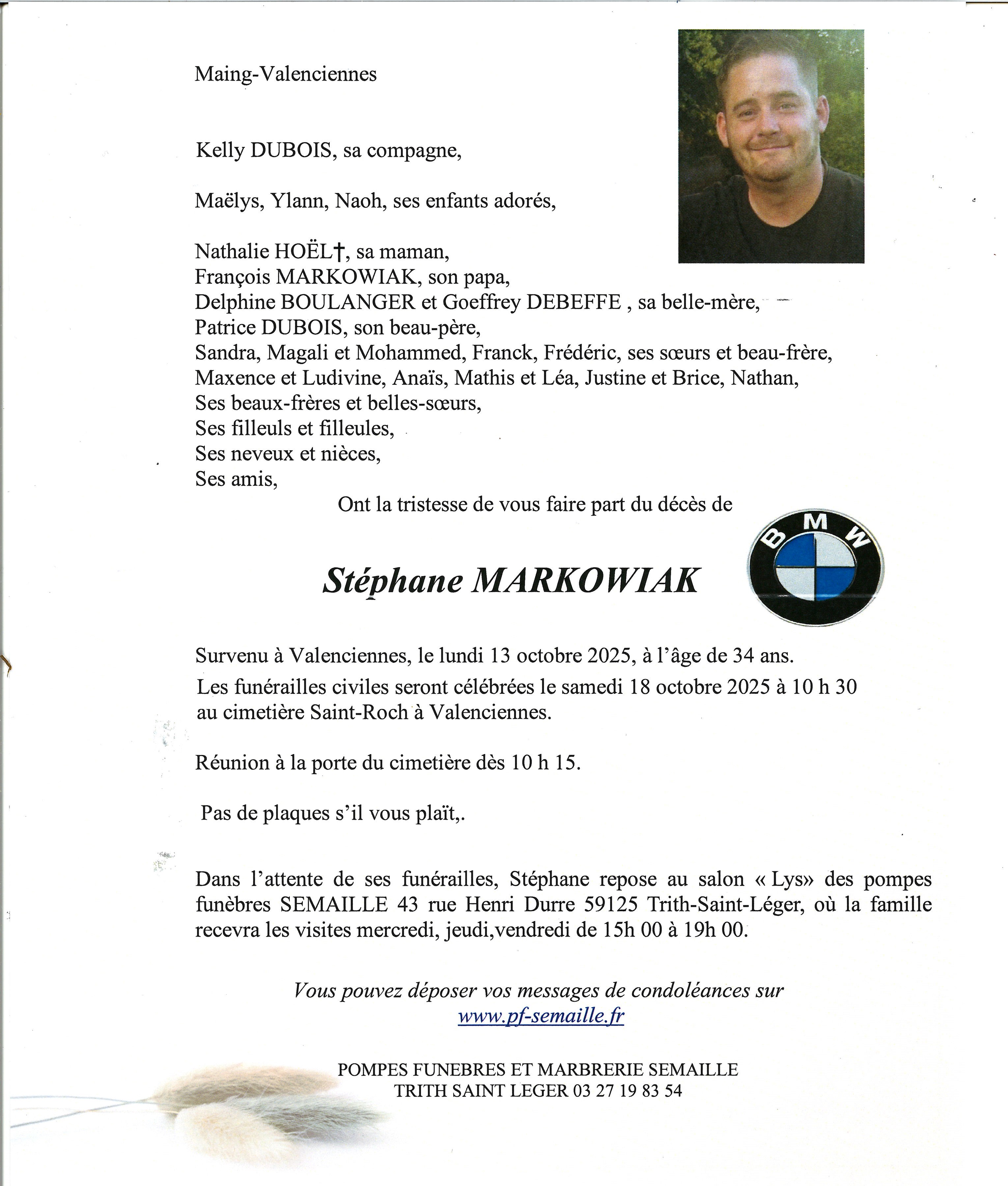 Avis de décès de Monsieur Stéphane MARKOWIAK