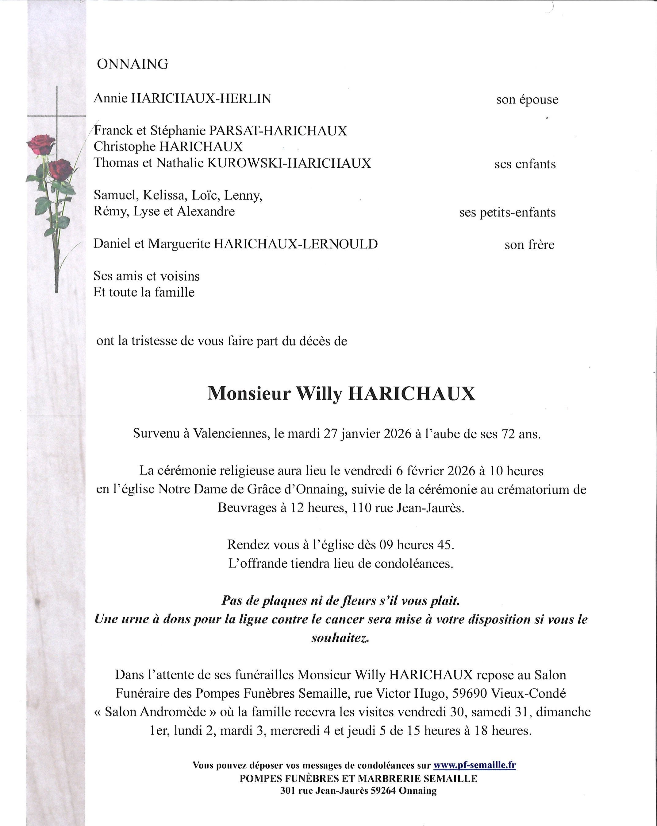 Avis de décès de Monsieur Willy HARICHAUX