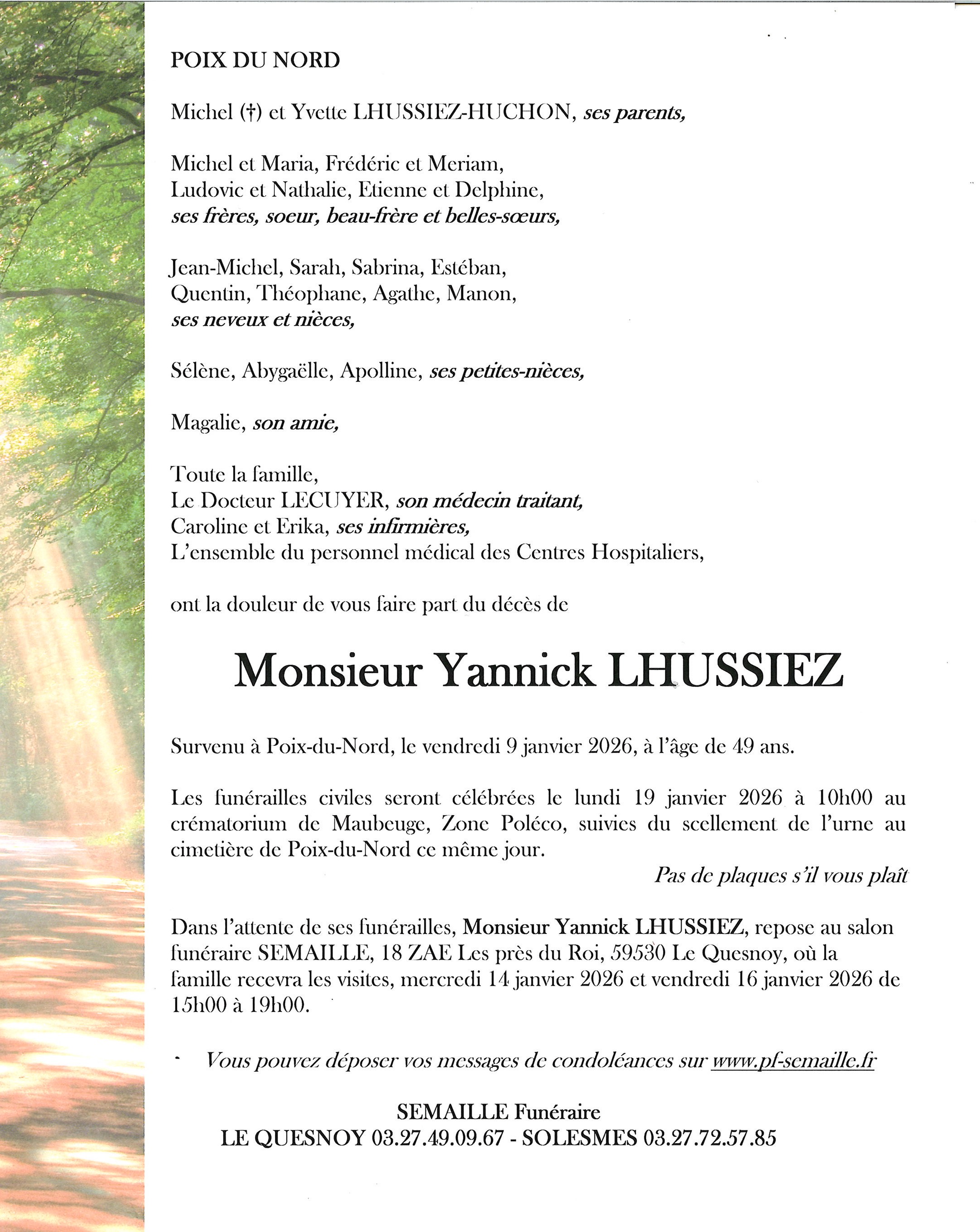 Avis de décès de Monsieur Yannick LHUSSIEZ